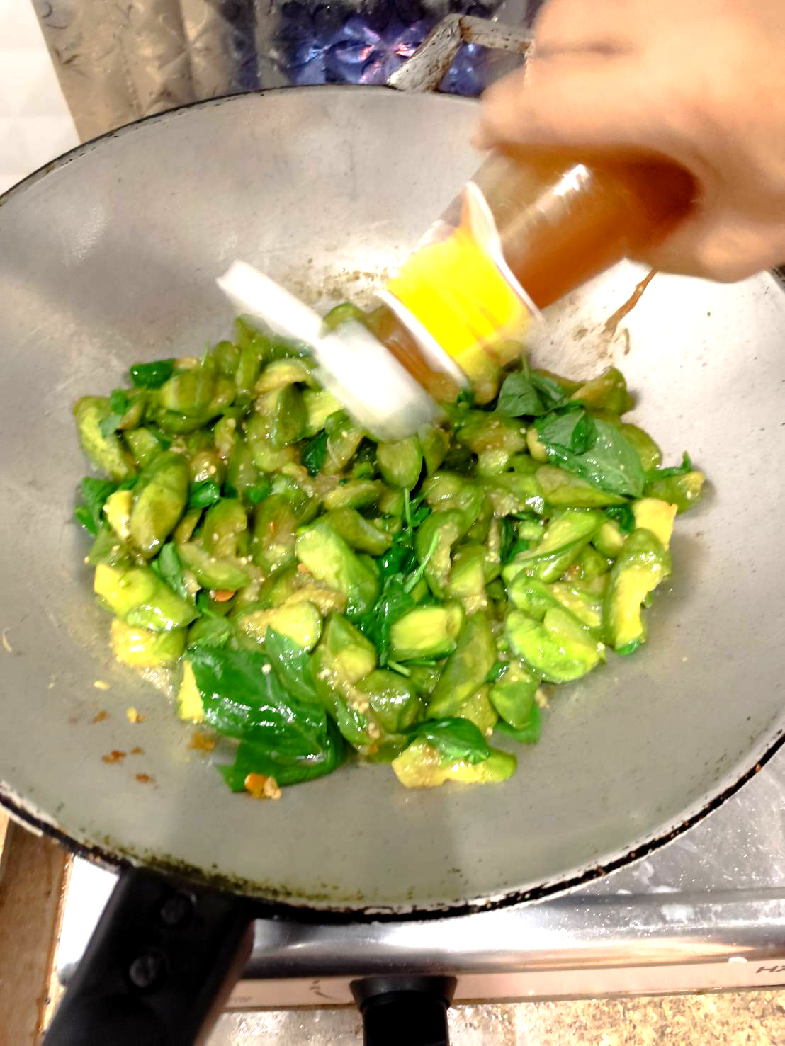 ปรุงรสด้วยซีอิ้วขาว, ซอสหอยนางรมเจ เกลือนิดนึง และใส่น้ำเปล่าลงไป