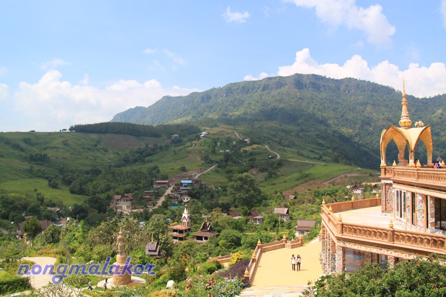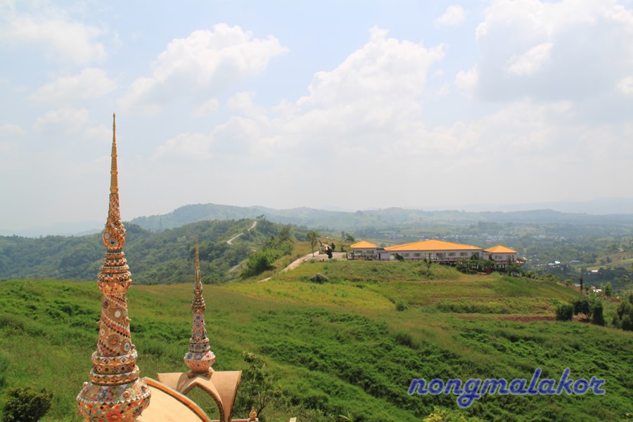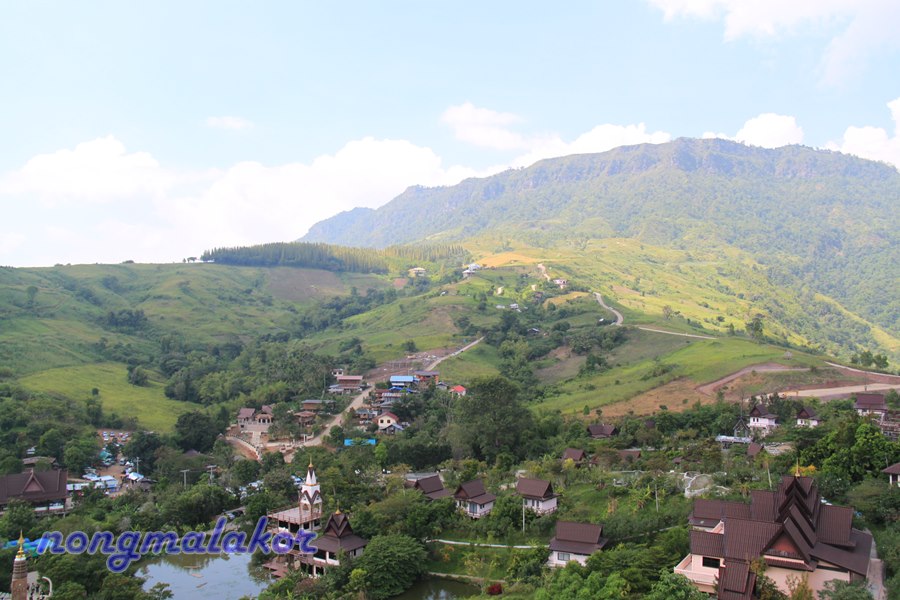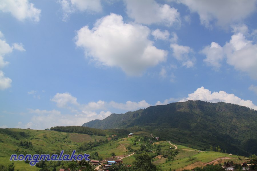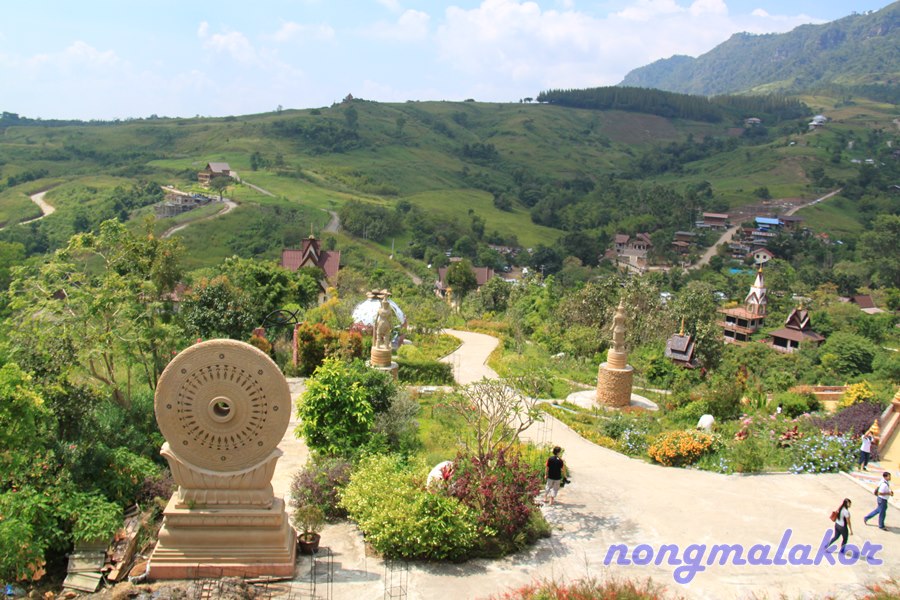 บรรยากาศภายนอกรอบวัด ไปเดือน ต.ค.55 ครั้งแรก ช่วงสายเกือบเที่ยงยังไม่มีหมอก แต่วิวรอบเนินเขา ไม่มีสิ่งก่อสร้าง ตึกสูงๆ มาบดบัง รบกวนทางสายตา ธรรมชาติ เขียวขจีมาก มีหมู่บ้านเล็ก อยู่บนบริเวณเนินเขาในหมู่ของหมู่บ้านทางแดง (ไม่รู้ใช่เปล่าเคยหาข้อมูลบันทึกไว้ในบล็อก) กับวิถีชุมชน คนท้องถิ่น เห็นแล้วสดชื่น สุดใจ ถ้าพื้นที่หมู่บ้านยังใช้ชีวิตอยู่แบบนี้ น่าอิจฉาอยากใช้ชีวิตอยู่แบบนี้จัง เรียบง่ายสงบ กลมกลืนกับธรรมชาติมาก อยู่นนทบุรี ก็ทำใจเรื่องการจรจร มีแต่ตึกใหญ่สูงๆ ร้อนมาก นอนในห้องเปิดแอร์เย็นฉ่ำ ถ้าไม่มีแอร์มานอนกลางธรรมชาติที่หมู่บ้านทางแดง แบบนี้ผูกเปลหรือทำแคร่ นอนใต้ต้นไม้เย็นสบายกว่าเยอะ แล้วเดินเล่นออกกำลังกายในป่า ไม่เบื่อรถติด รถวิ่งกันเร็วมาก เดี๋ยวเจอสัตว์ตามป่า จะวิ่งมาชนผมไหมเนี้ย แต่ก็มีความสุขเหมือนกันเนอะ แถมมีความสุขตอนเช้า เจอหมอก ปุยเมฆ ท่ามกลางธรรมชาติ อาบน้ำไม่เอาอ่างอาบน้ำ แค่ตักน้ำในโอ่งอาบแบบนี้ตั้งแต่เด็กแล้ว อยู่ง่ายๆ ไม่ชอบหรูหราแบบสังคมในเมือง ผมก็คิดไปเรื่อยเปื่อย