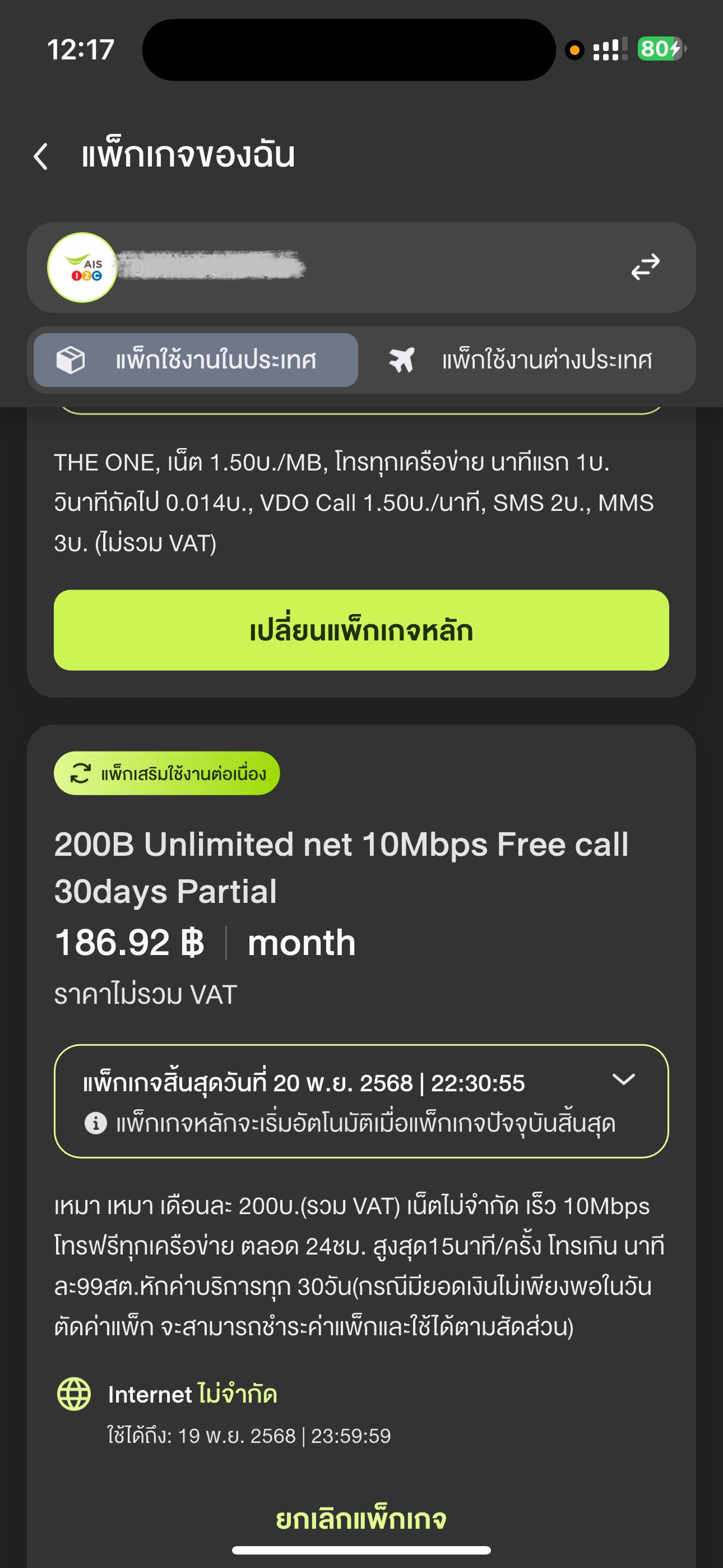 โปร ais 10mbps โทรฟรีทุกเครือข่าย 200/เดือน หมดอายุเดือนหน้า อยากต่ออายุโปรเดิมค่ะ