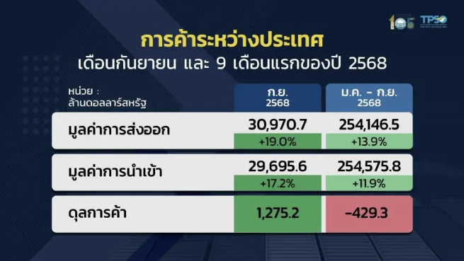 พาณิชย์ เผย การส่งออกเดือน ก.ย. ฟื้นตัวแข็งแกร่งเกินคาด ขยายตัว 19.0% สูงสุดในรอบ 42 เดือน จากอุปสงค์สินค้าอุตสาหกรรมที่เติบโตต่อเนื่อง ท่ามกลางแรงกดดันทางการค้าโลก ภาพรวมการส่งออก 9 เดือนแรกของปี 2568 ขยายตัวที่ 13.9 % คาดทั้งปีส่งออกขยายตัว 9.4-10.4% สูงสุดเป็นประวัติการณ์ทั้งมูลค่าและอัตราการขยายตัว