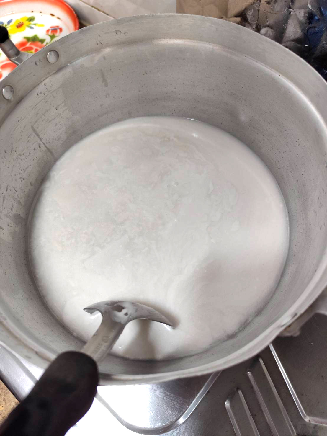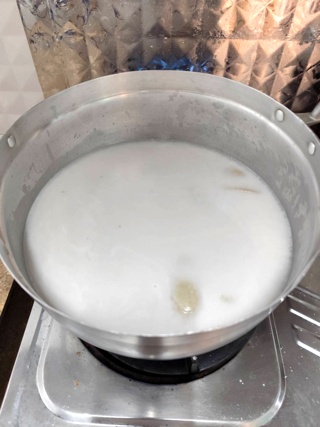 ตั้งหม้อใส่น้ำกะทิ ใส่น้ำตาลทรายและเกลือลงไปต้ม