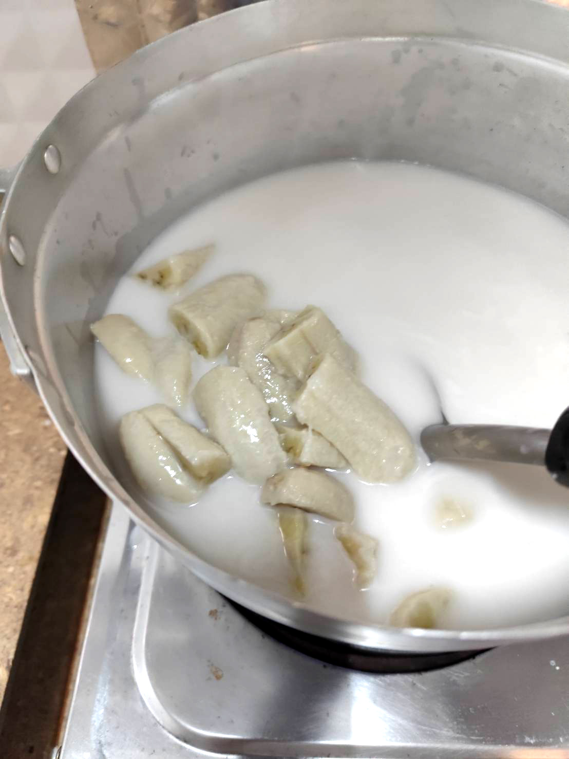 พอน้ำกะทิเดือดแล้ว ใส่กล้วยน้ำว้าที่เตรียมไว้ลงไปต้มต่อ
