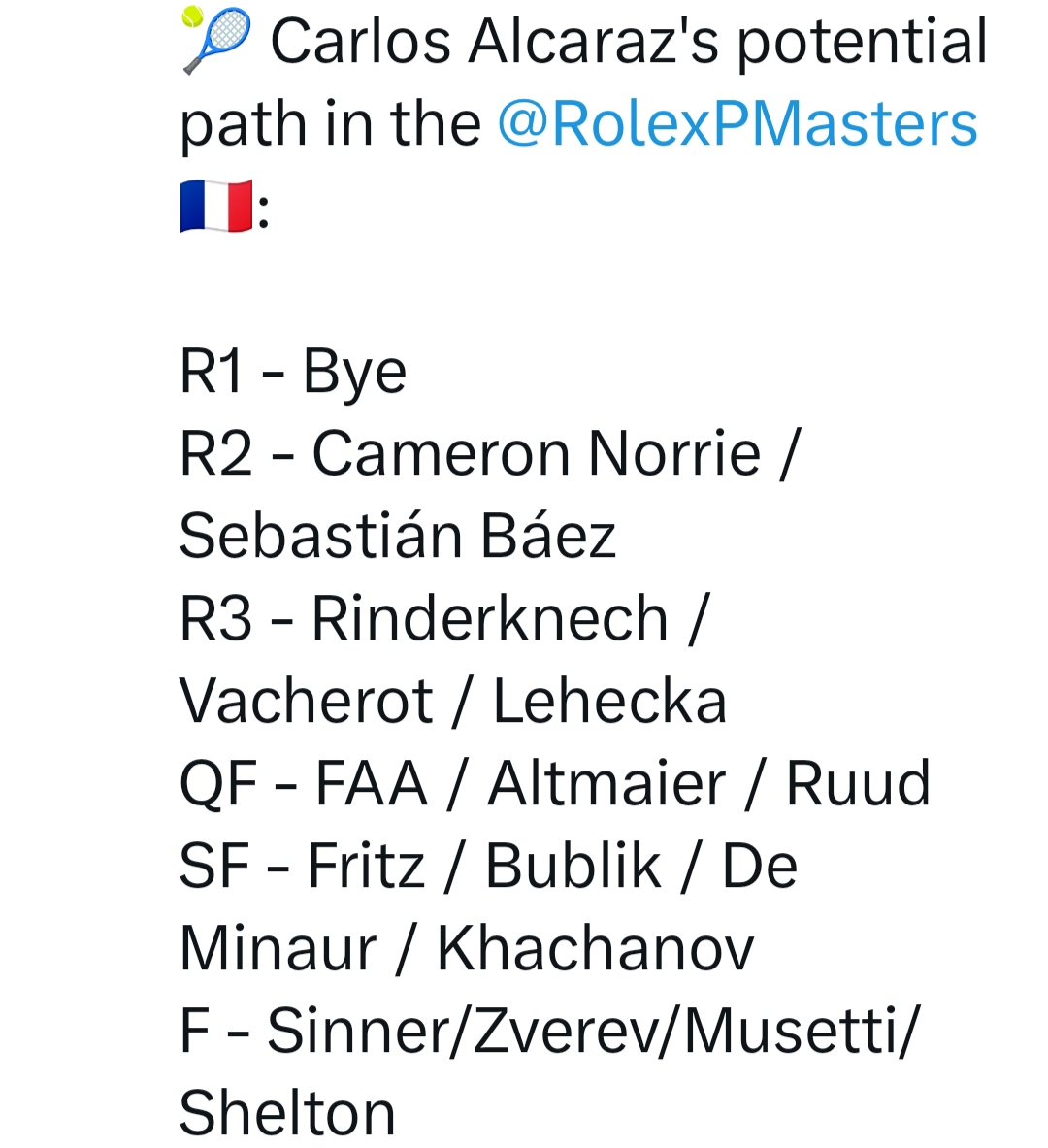 นับว่า Alcaraz เจอสายไม่ง่าย เพราะมีสิทธิ์เจอ Valentin Vacherot เจ้าของแชมป์รายการเซี่ยงไฮ้มาสเตอร์คนล่าสุดในรอบสาม