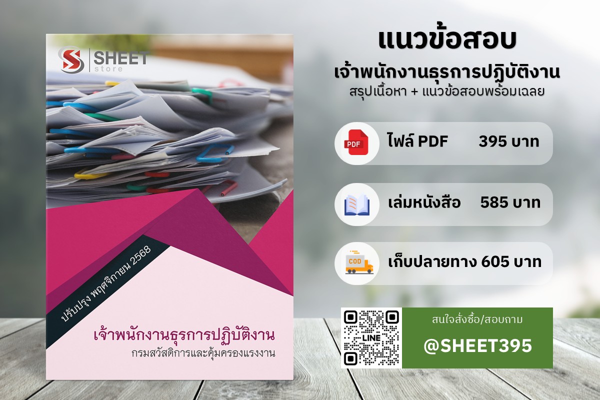แนวข้อสอบ เจ้าพนักงานธุรการปฏิบัติงาน กรมสวัสดิการและคุ้มครองแรงงาน ฉบับสมบูรณ์ พฤศจิกายน 2568 สรุปเนื้อหา + แนวข้อสอบพร้อมเฉลยอธิบาย จัดทำโดยทีมงานมืออาชีพมากประสบการณ์ ครบถ้วนทุกเนื้อหาในเล่มเดียว ตรงตามประกาศสอบ