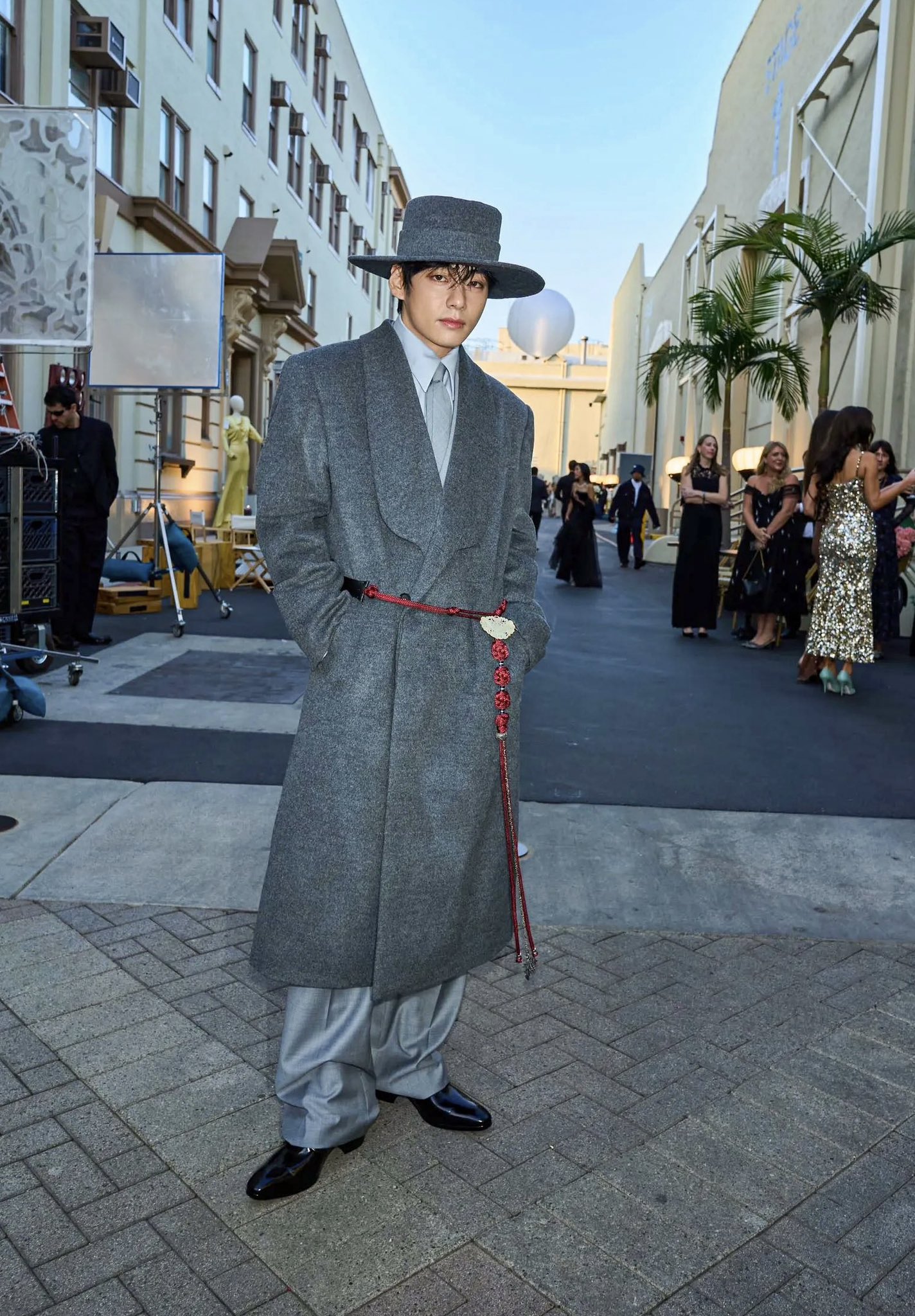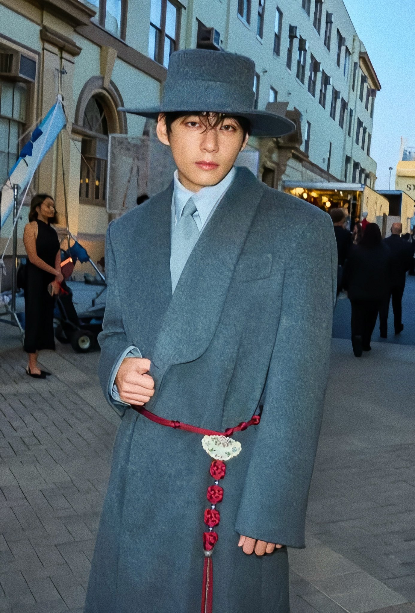 เขาสวมใส่โค้ตสีเทาทรงยาวเข้ารูป มีปกเสื้อโดดเด่น ทั้งยังสวมหมวกปีกกว้างสีเดียวกัน และคอมพลีตลุคด้วยเข็มขัดพู่ห้อยสีแดงประดับหยกอันเป็นเอกลักษณ์ของโชซอน ซึ่งสะท้อนให้เห็นถึงความงามอันทรงคุณค่าของเกาหลีที่ผสมผสานกับความทันสมัยของแฟชั่นยุคใหม่ได้อย่างลงตัว