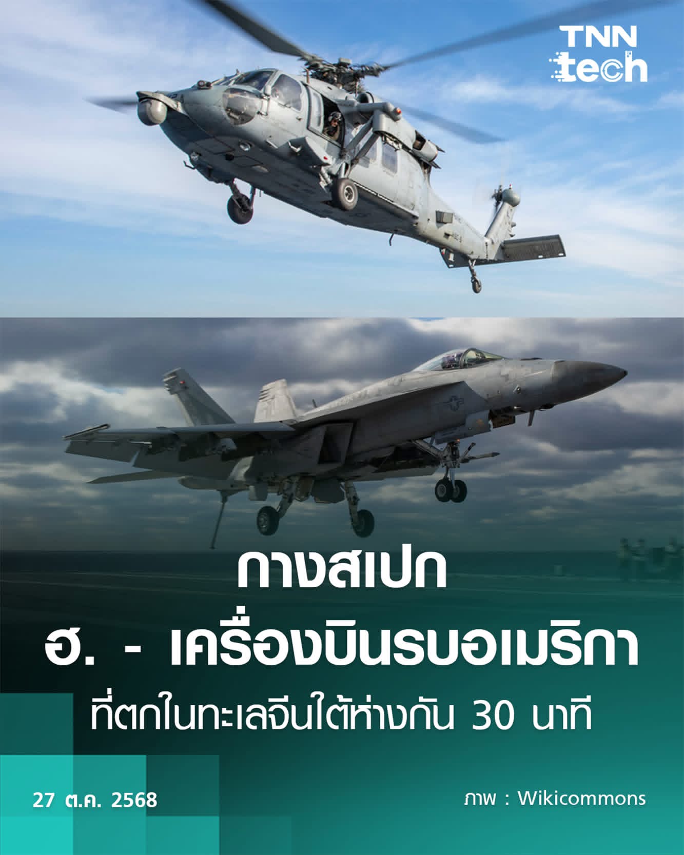 TNN Tech เปิดสเปกเฮลิคอปเตอร์ซีฮอว์ก เอ็มเอช-60 อาร์ (Sea Hawk MH-60R) และเครื่องบินขับไล่แบบเอฟเอ-18 เอฟ ซูเปอร์ ออร์เน็ต (F/A-18F Super Hornet) ที่ประสบอุบัติเหตุตกบริเวณทะเลจีนใต้เมื่อวันที่ 26 ตุลาคม ในเวลาห่างกันเพียง 30 นาที