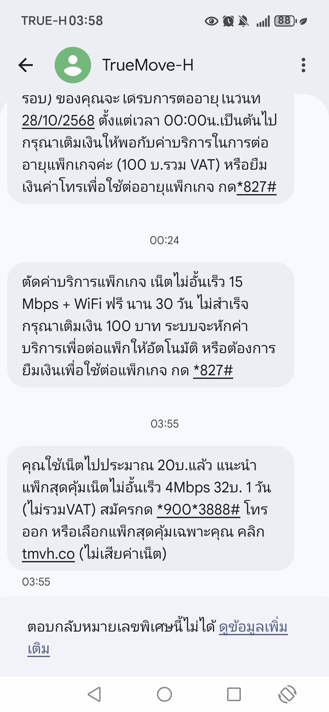 หนูใช้ซิมเน็ตทรูแบบเติมเงิน เดือนละ 150 บาทค่ะ ปกติระบบจะต่อแพ็กเกจให้อัตโนมัติทุกเดือน แต่รอบนี้พอหนูเติมเงินเข้าไป มันขึ้นว่าหักค่าแพ็กเกจไปเรื่อย ๆ จาก 150 เหลือ 60 เหลือ 30 จนหมด แล้วขึ้นว่าหนูใช้