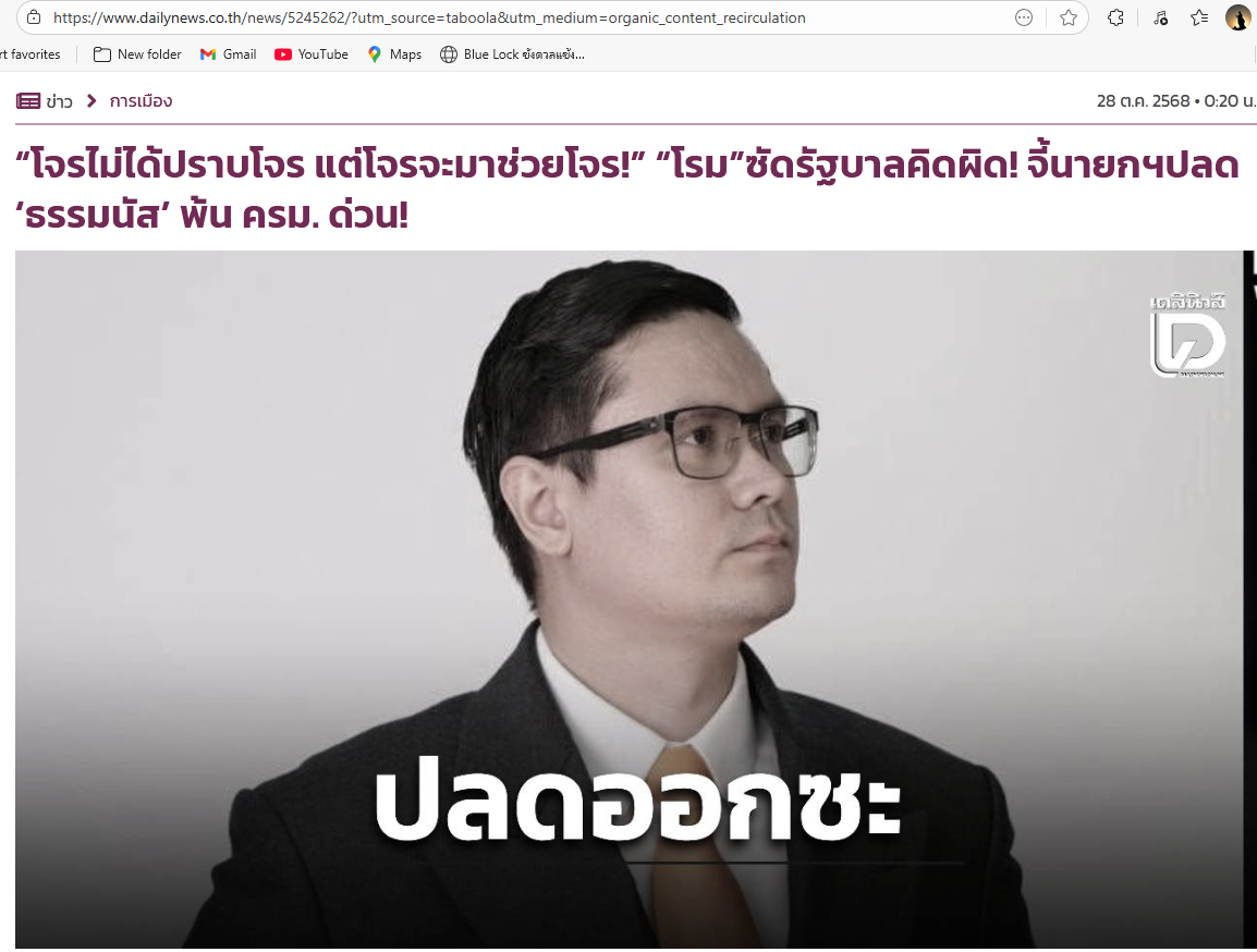 ‘เบน สมิท’ ส่งทนายทีม ร.อ.ธรรมนัส ฟ้อง ‘สส.โรม’ เรียกเงิน 100 ล. ... สามารถติดตามต่อได้ที่ : https://www.dailynews.co.th/news/5177714/ เท้ง ยัน ‘โรม’ ทำหน้าที่ถูก