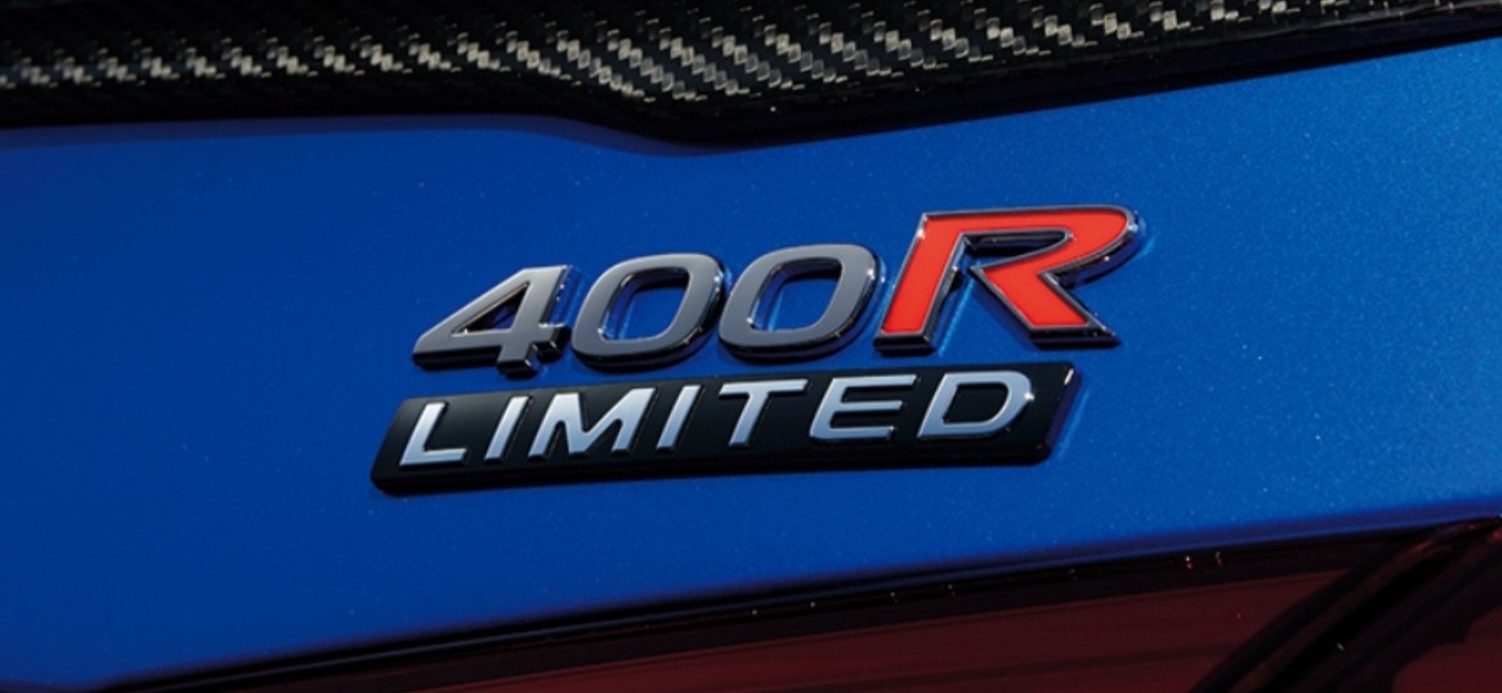บริเวณด้านท้ายมี ตราสัญลักษณ์ “400R Limited” ที่สะท้อนความพิเศษของรุ่น รวมถึง ป้ายหมายเลขลำดับการผลิต (Serial Number Plate) สำหรับระบุความเป็นเจ้าของเฉพาะคัน ภายในห้องโดยสารตกแต่งด้วย แผงคอนโซลกลางลายคาร์บอน (Carbon Finisher) ที่เพิ่มบรรยากาศแบบรถแข่งให้กับภายใน พร้อมตราสัญลักษณ์ “400R Limited” บนแผงคอนโซลหน้า