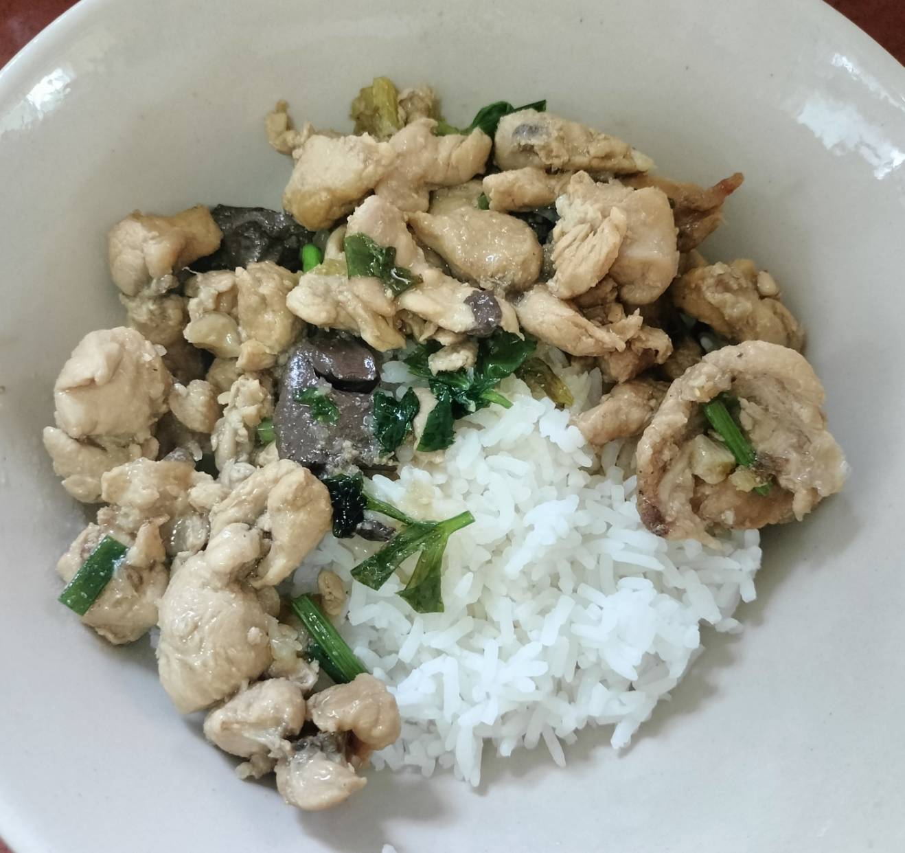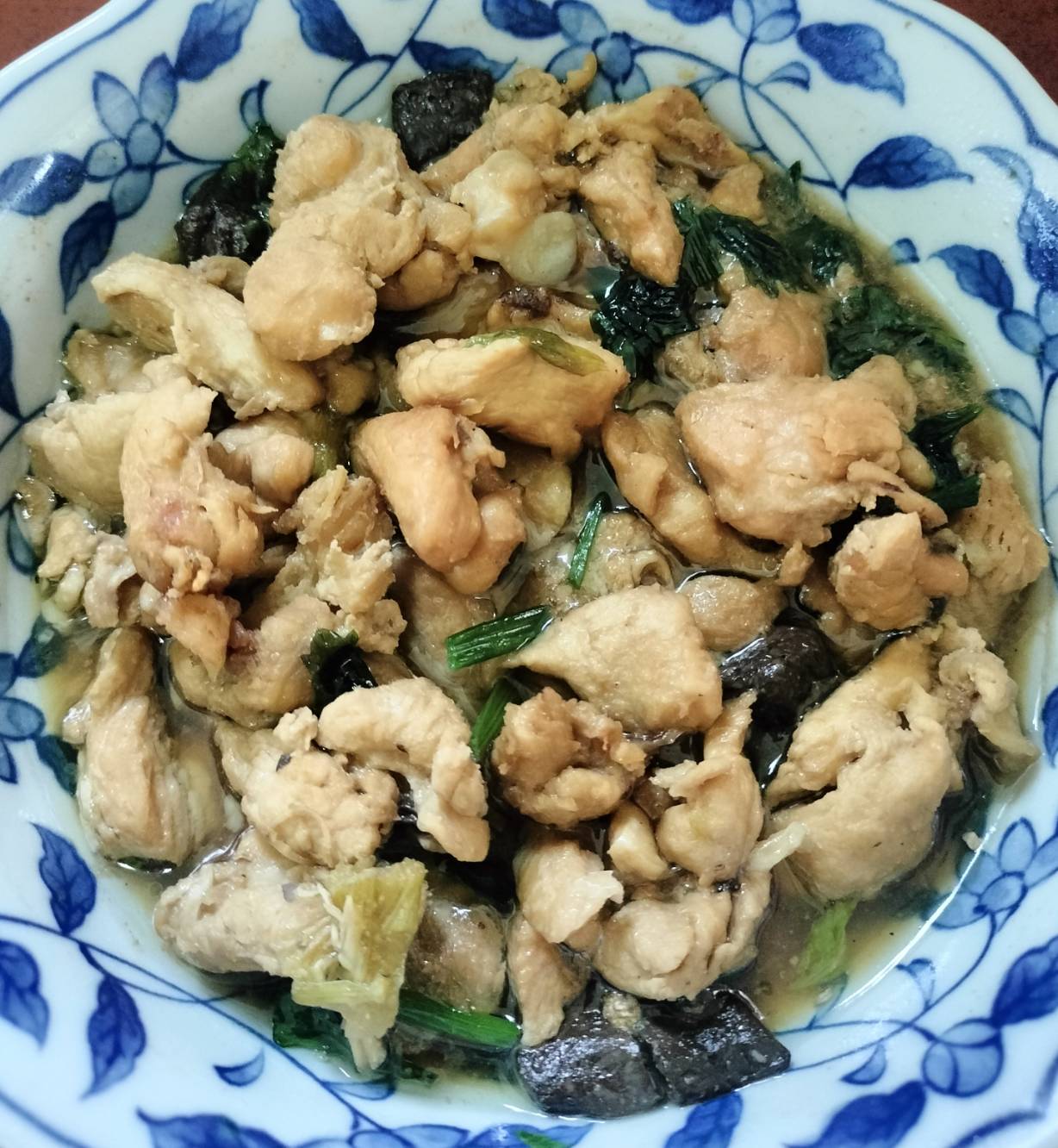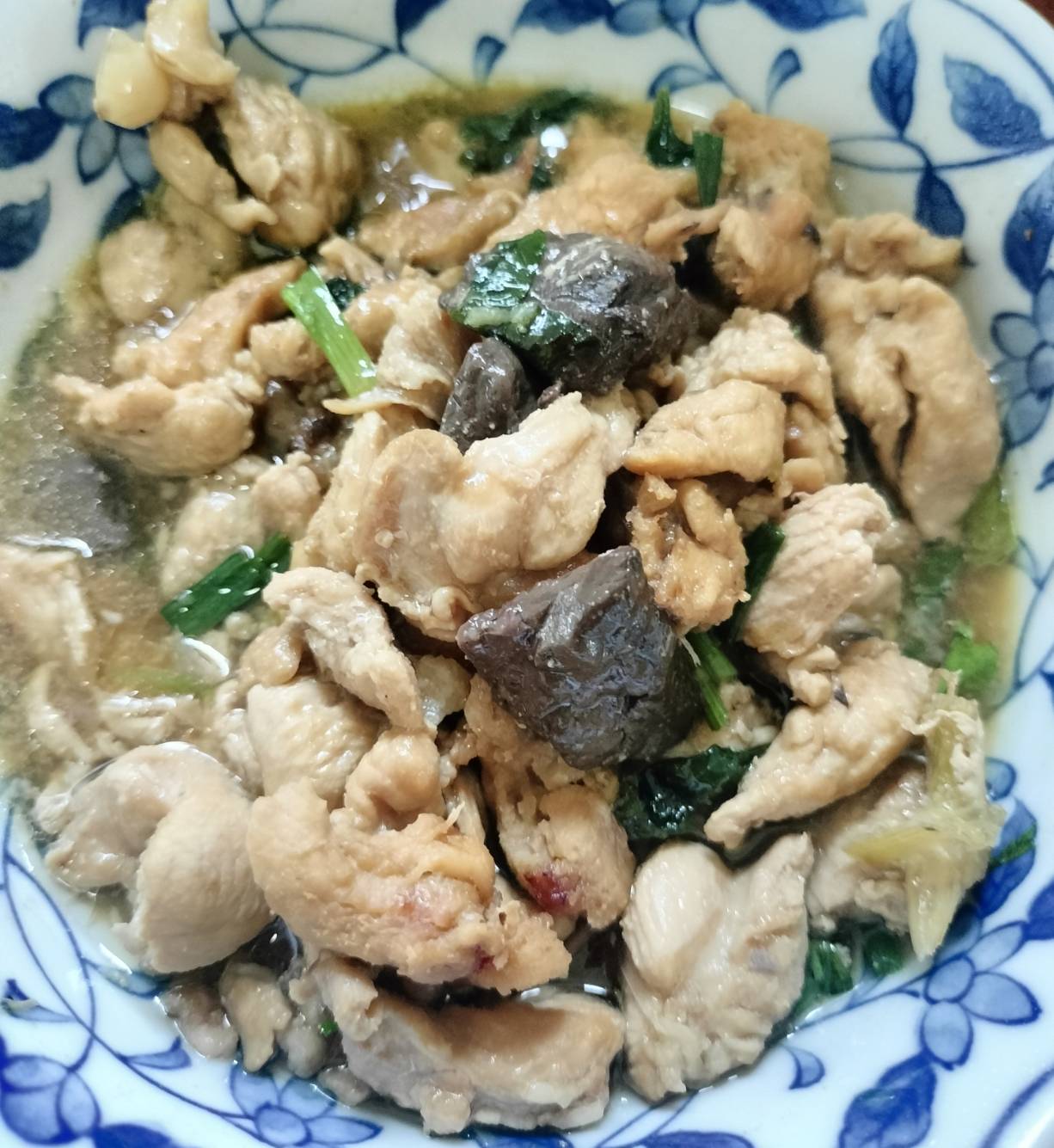 เป็นเนื้อไก่+เลือดไก่ ผัดๆรวนๆกับสามเกลอและเครื่องเทศ
