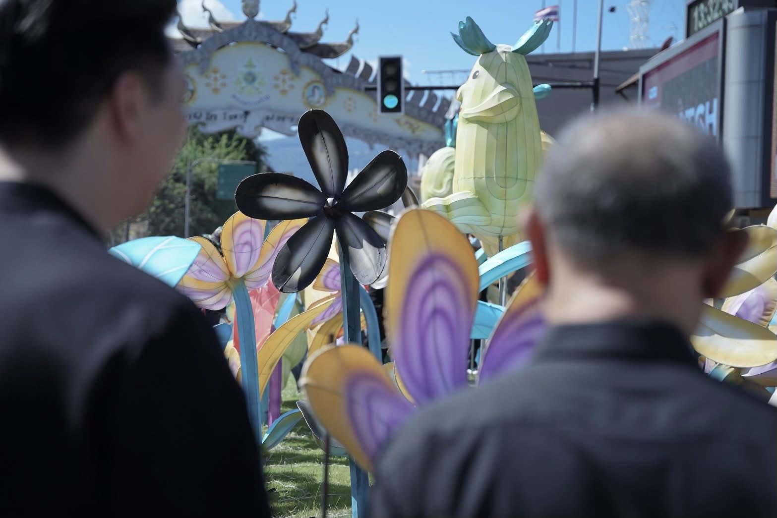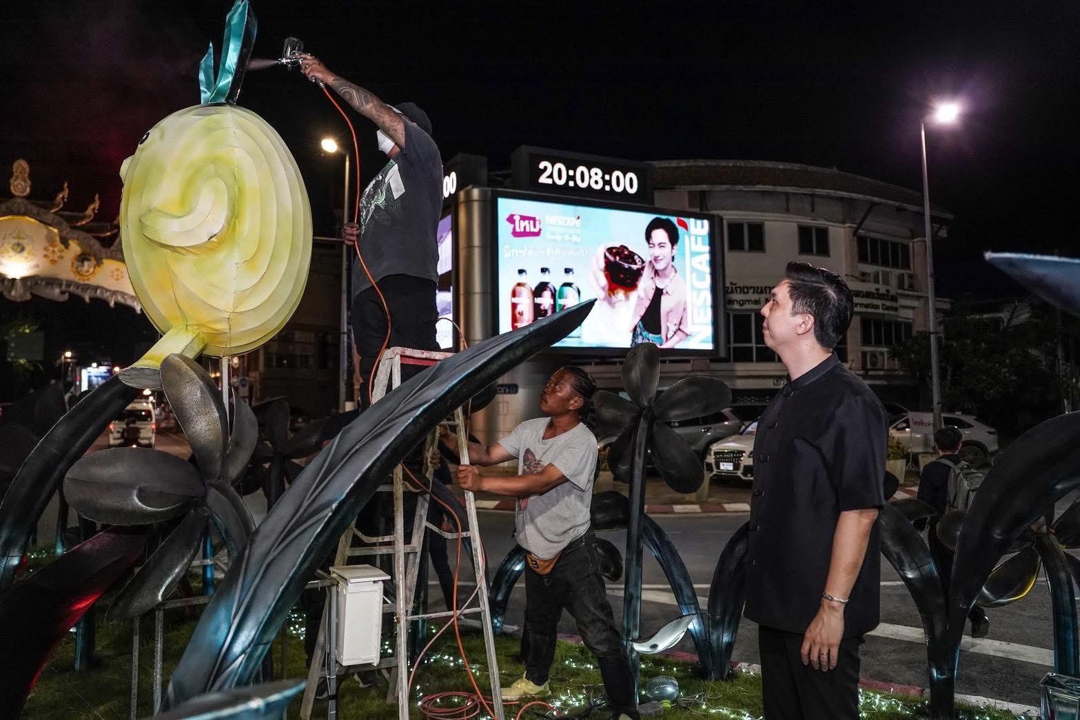 โดยมีการนำสเปรย์สีดำ มาพ่นทับดอกไม้ประดับไฟนำมาตกแต่งเมืองตามจุดต่าง ๆ โดยเฉพาะบริเวณเกาะกลางถนนเชิงสะพานนวรัฐ ฝั่งตะวันตก