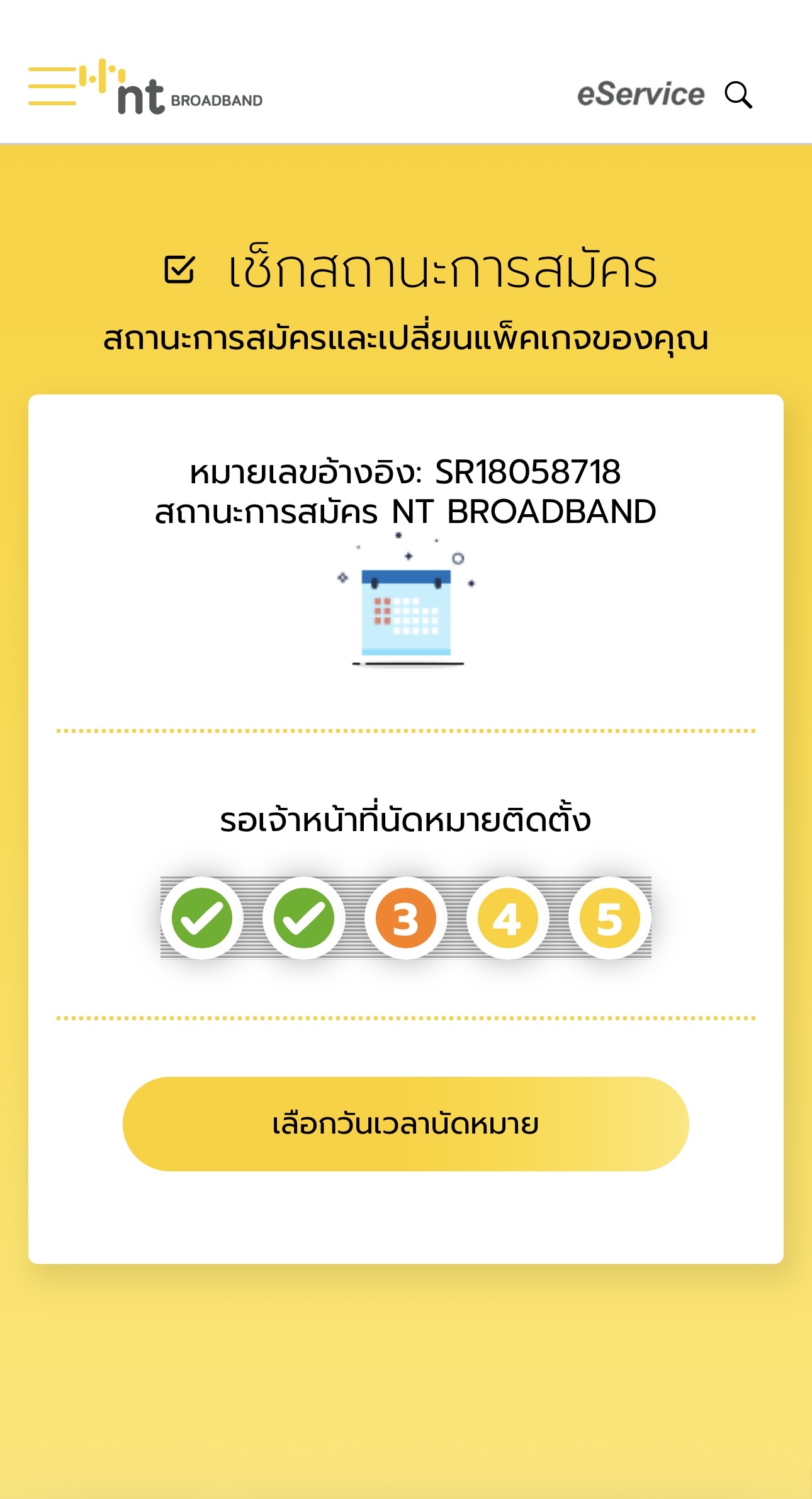 สวัสดีครับ ผมได้ทำการรอติดตั้งเน็ตของ nt ผ่านทาง line official ไปแล้ว แต่พอมาเช็คสถานะการติดตั้ง แล้วขึ้นแบบนี้ในเว็บคือแปลว่าเราเลือกวันไปแล้วแต่ในระบบไม่ขึ้น หรือว่ารอแค่ช่างมาติดตั้งอย่างเดียวครับ ปล.ผมลงเป็นรอวันมาติดตั้งวันนี้ วันที่ 28 ตุลา ช่วงเช้าครับ