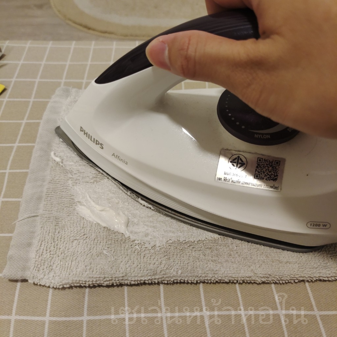 อุ่นเตารีดไว้ก่อน แล้วก็เอาเตารีดนาบลงไปบนครับ ใช้แรงถูๆวนไปวนมา