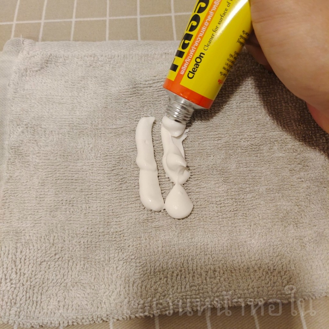 วิธีการก็บีบครีมคลีออน ลงไปบนผ้าขี้ริ้ว พับหลายๆชั้นนะครับ