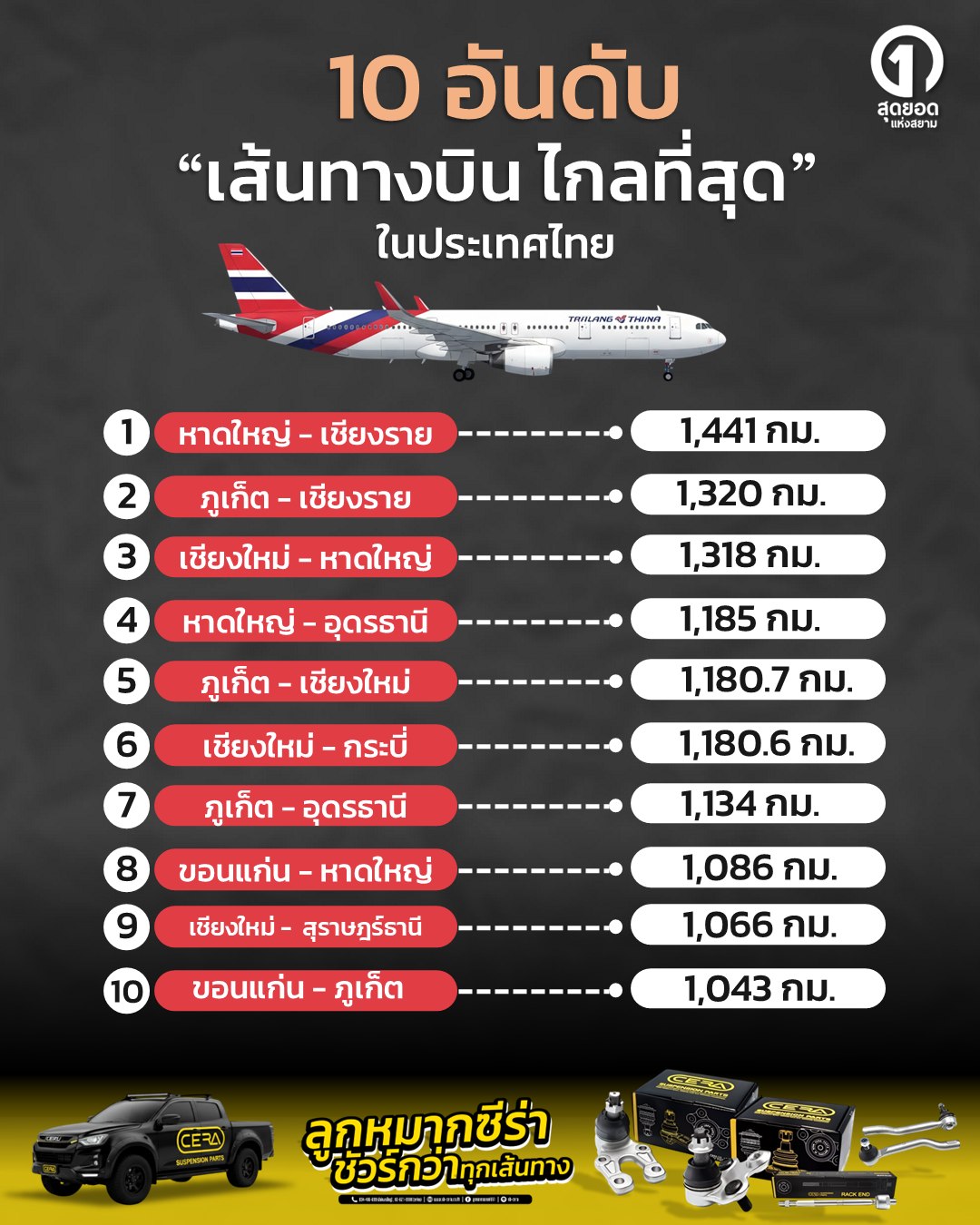 1 หาดใหญ่-เชียงราย 1,441 กม.