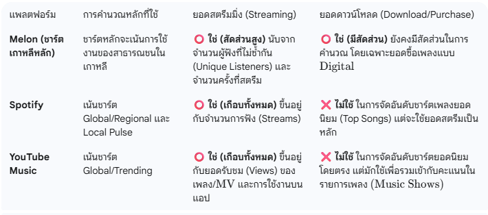 2. ด้วยความที่ผมอยากรู้แหละนะ เลยถาม AI ต่อไปว่าแล้วชาร์ทเพลงตามแพลตฟอร์มหลักต่างๆมีปัจจัยอะไรบ้างในการคำนวณเพื่อจัดอันดับชาร์ท