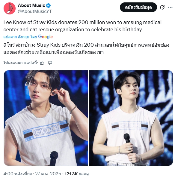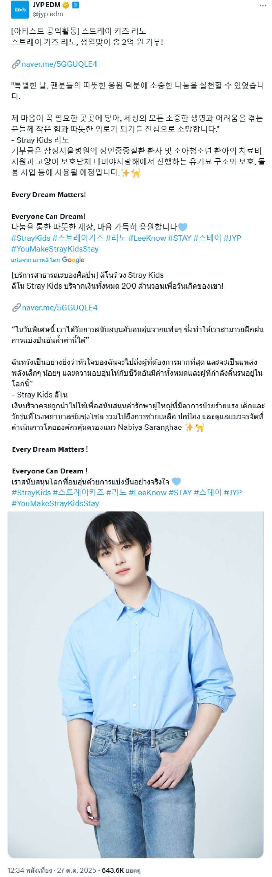 🔥 Stray Kids LeeKnow บริจาคเงิน 200 ล้านวอนในวันเกิดโดยมอบ 100 ล้านวอนศูนย์การแพทย์ซัมซุงและ 100 ล้านวอนกลุ่มปกป้องแมว