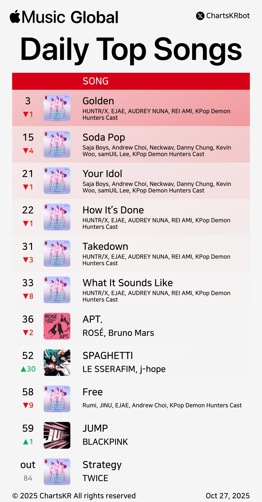 LE SSERAFIM "SPAGHETTI (feat. j-hope)" นิวพีคที่อันดับ #52 (+30) บน Apple Music Global