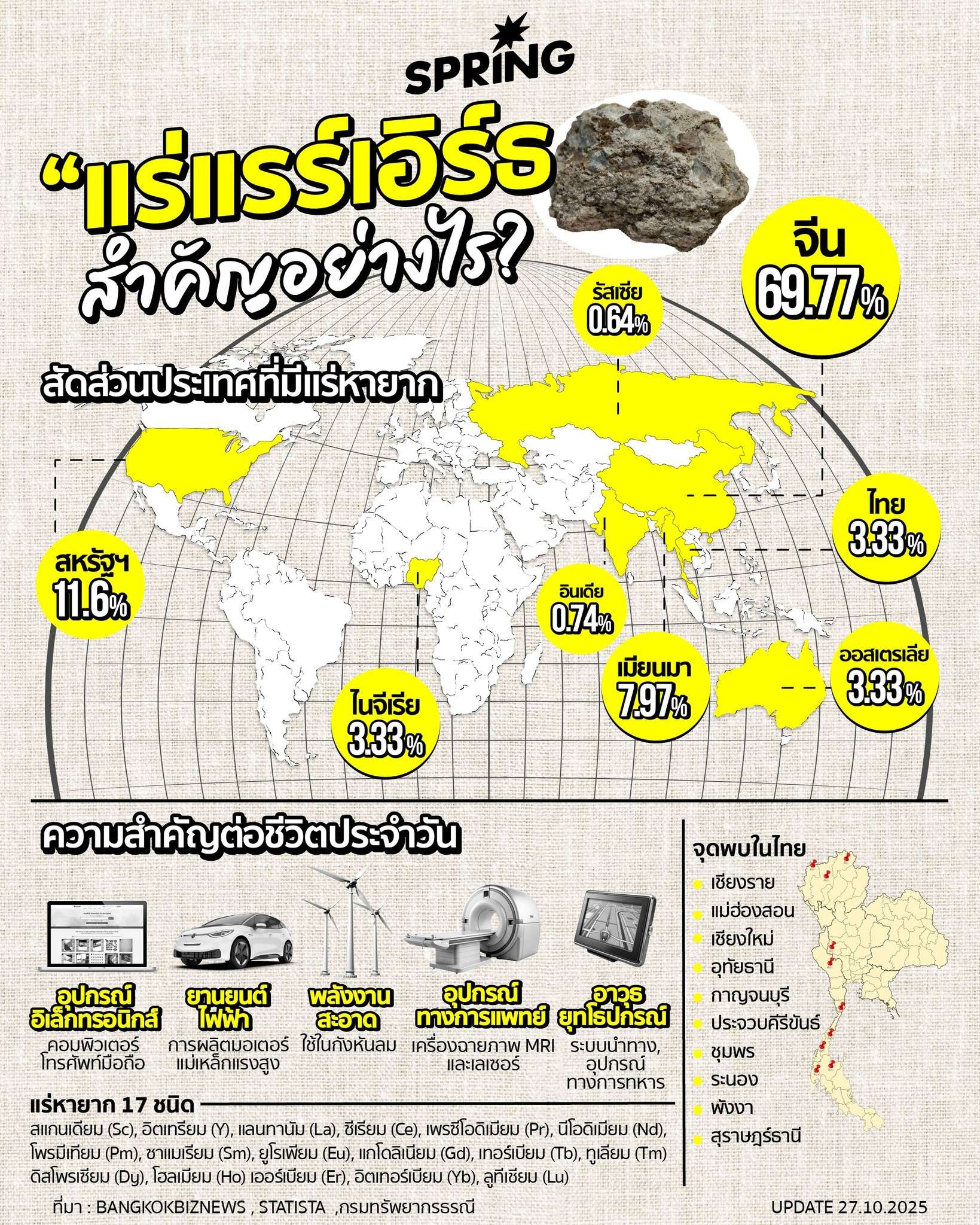 แร่แรร์เอิร์ธ หรือ แร่หายาก (Rare Earth Elements ) คือกลุ่มโลหะ 17 ชนิดที่เป็น หัวใจสำคัญของเทคโนโลยี ยุคใหม่ ตั้งแต่สมาร์ทโฟน รถยนต์ไฟฟ้า (EV) ไปจนถึงอาวุธยุทโธปกรณ์ ด้วยคุณสมบัติพิเศษ เช่น การนำไฟฟ้าสูงและการสร้าง แม่เหล็กถาวรประสิทธิภาพสูง ทำให้ REEs เป็น ทรัพยากรยุทธศาสตร์ ที่กำหนดอำนาจในอุตสาหกรรมไฮเทค พลังงานสะอาด และการป้องกันประเทศ การครอบครองและแปรรูปแร่เหล่านี้จึงเป็น หมากสำคัญในเกมภูมิรัฐศาสตร์โลก