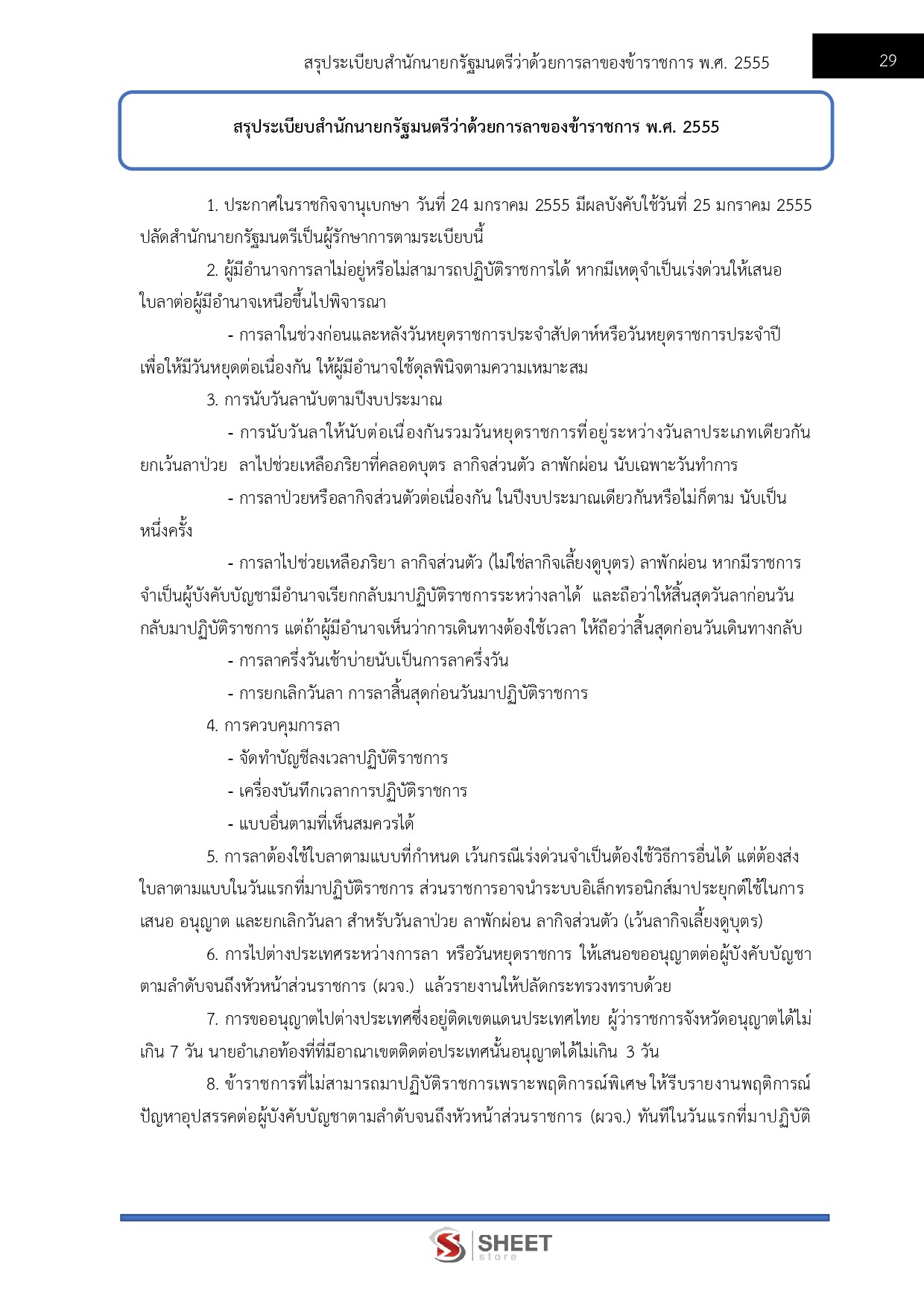 - สรุประเบียบสำนักนายกรัฐมนตรีว่าด้วยการลาของข้าราชการ พ.ศ.2555