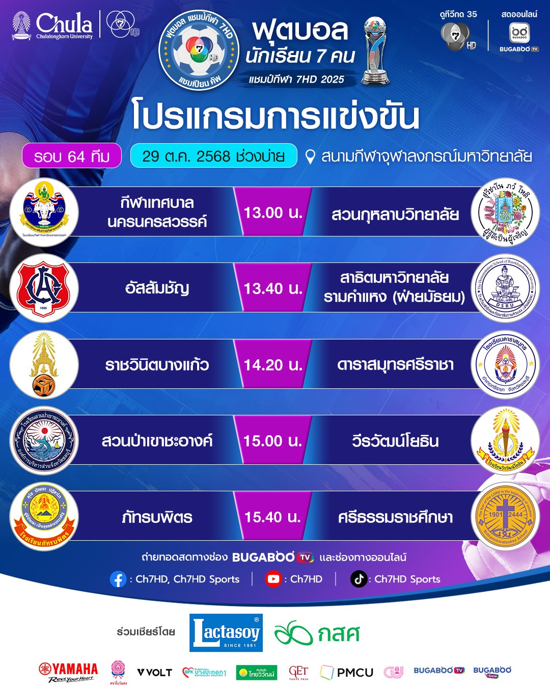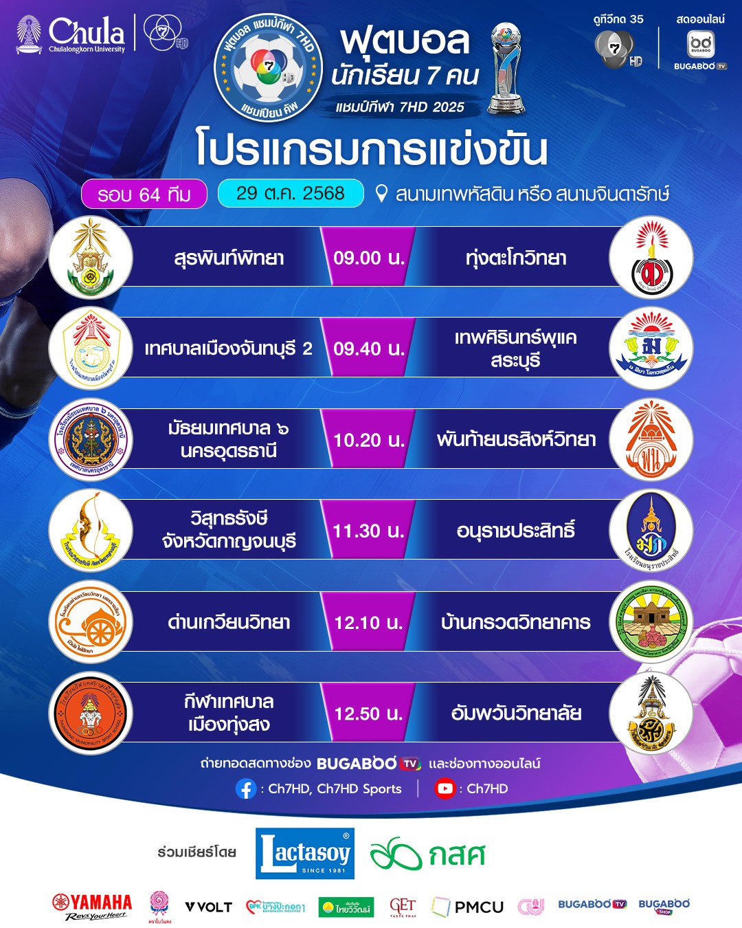 โปรแกรมการแข่งขัน ฟุตบอลนักเรียน 7 คน แชมป์กีฬา 7HD 2025 26 ต.ค 68