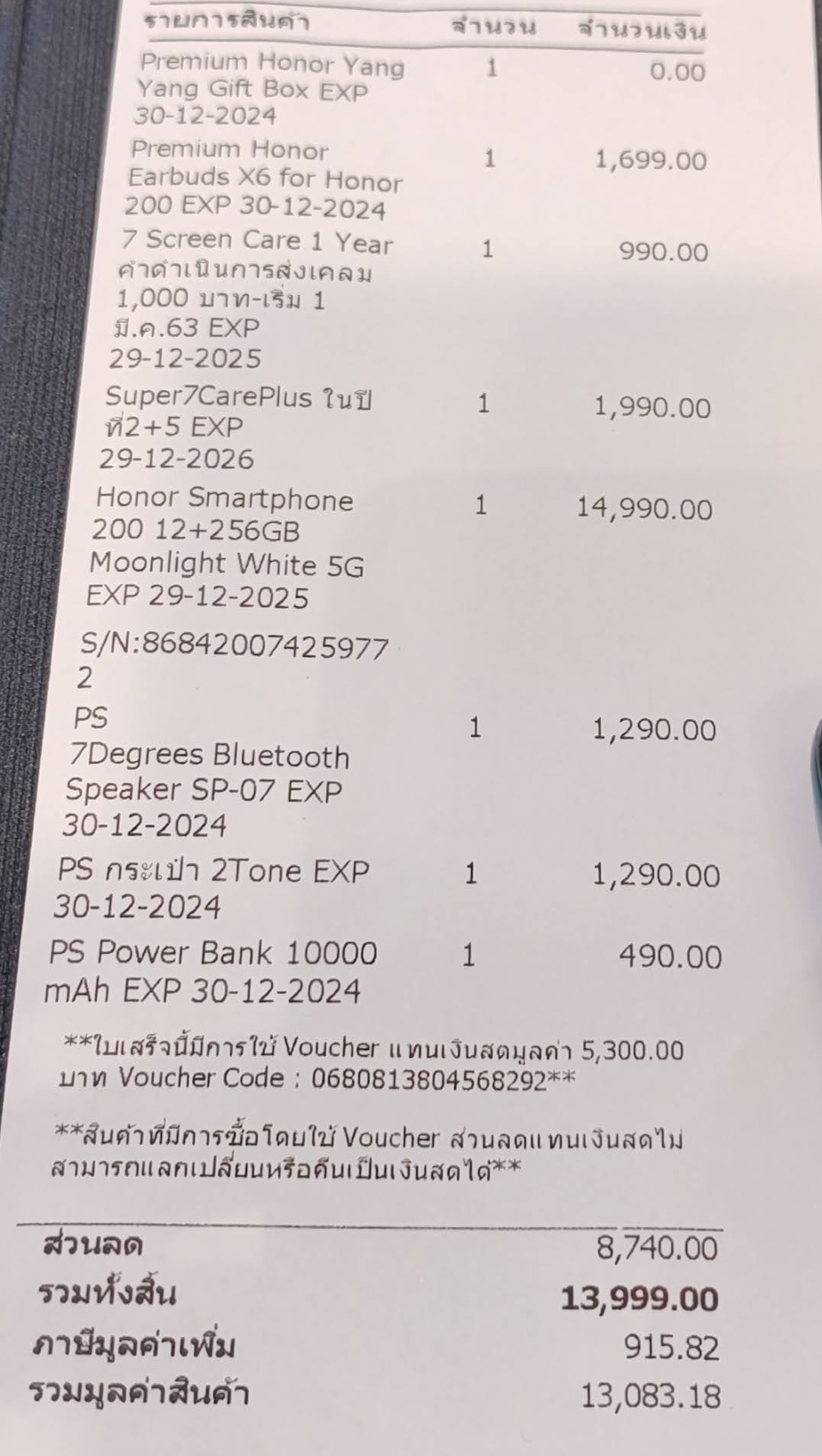พอดีว่าซื้อมือถือ honor 200 มาจากbananaแล้วตอนนี้ทำจอแตกครับ ช่วยดูจากใบเสร็จให้หน่อยได้มั้ยครับว่ามีประกันรึป่าว ครอบคลุมมั้ย