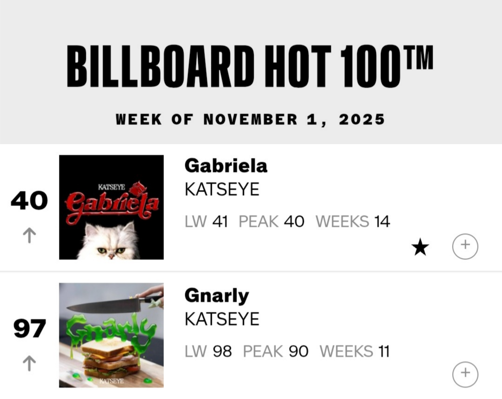 KATSEYE "Gabriela" ขึ้นสู่อันดับที่ #40 บนชาร์ต Billboard HOT 100 [สัปดาห์ที่ 14] และ #97 "Gnarly" [สัปดาห์ที่ 11]