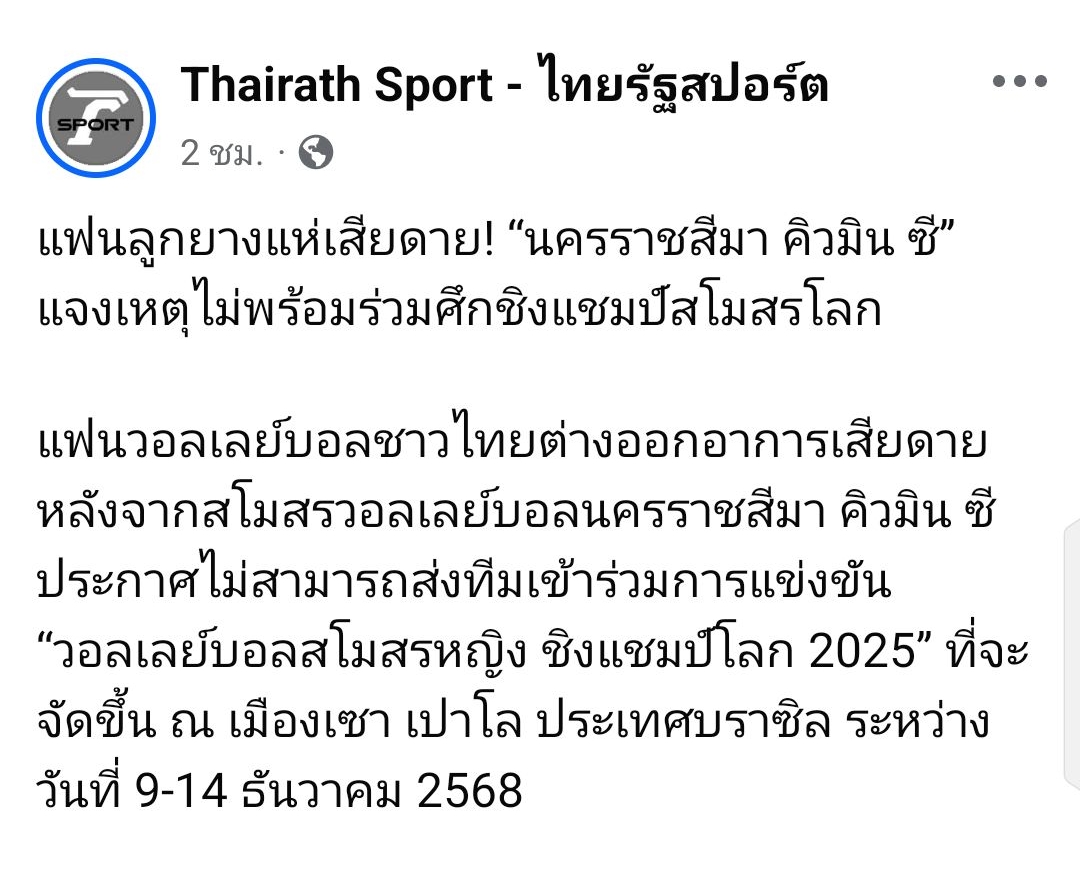 🏐 แฟนลูกยางแห่เสียดาย! “นครราชสีมา คิวมิน ซี” แจงเหตุไม่พร้อมร่วมศึกชิงแชมป์สโมสรโลก