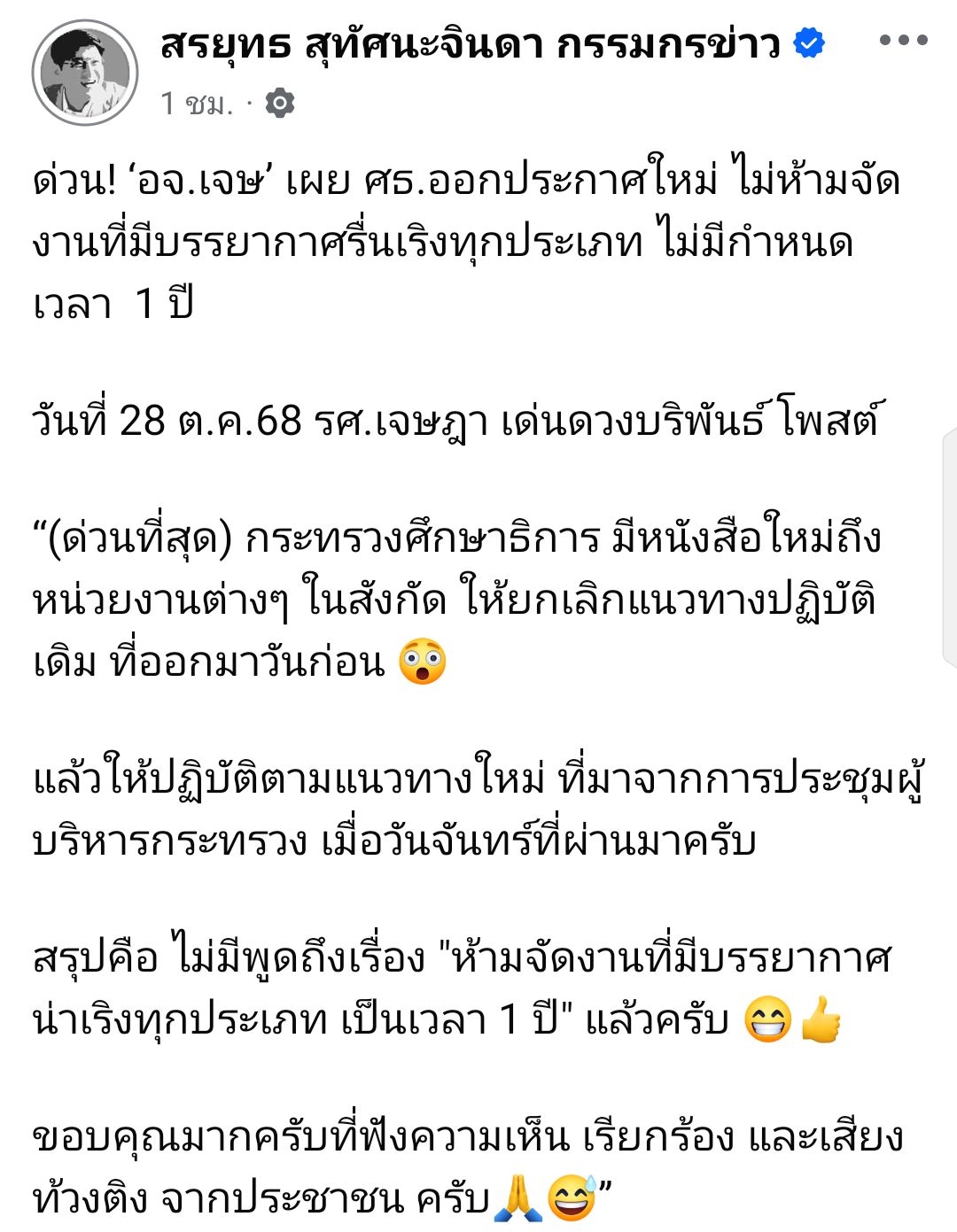 🔎 ด่วน! ‘อจ.เจษ’ เผย ศธ.ออกประกาศใหม่ ไม่ห้ามจัดงานที่มีบรรยากาศรื่นเริงทุกประเภท ไม่มีกำหนดเวลา 1 ปี