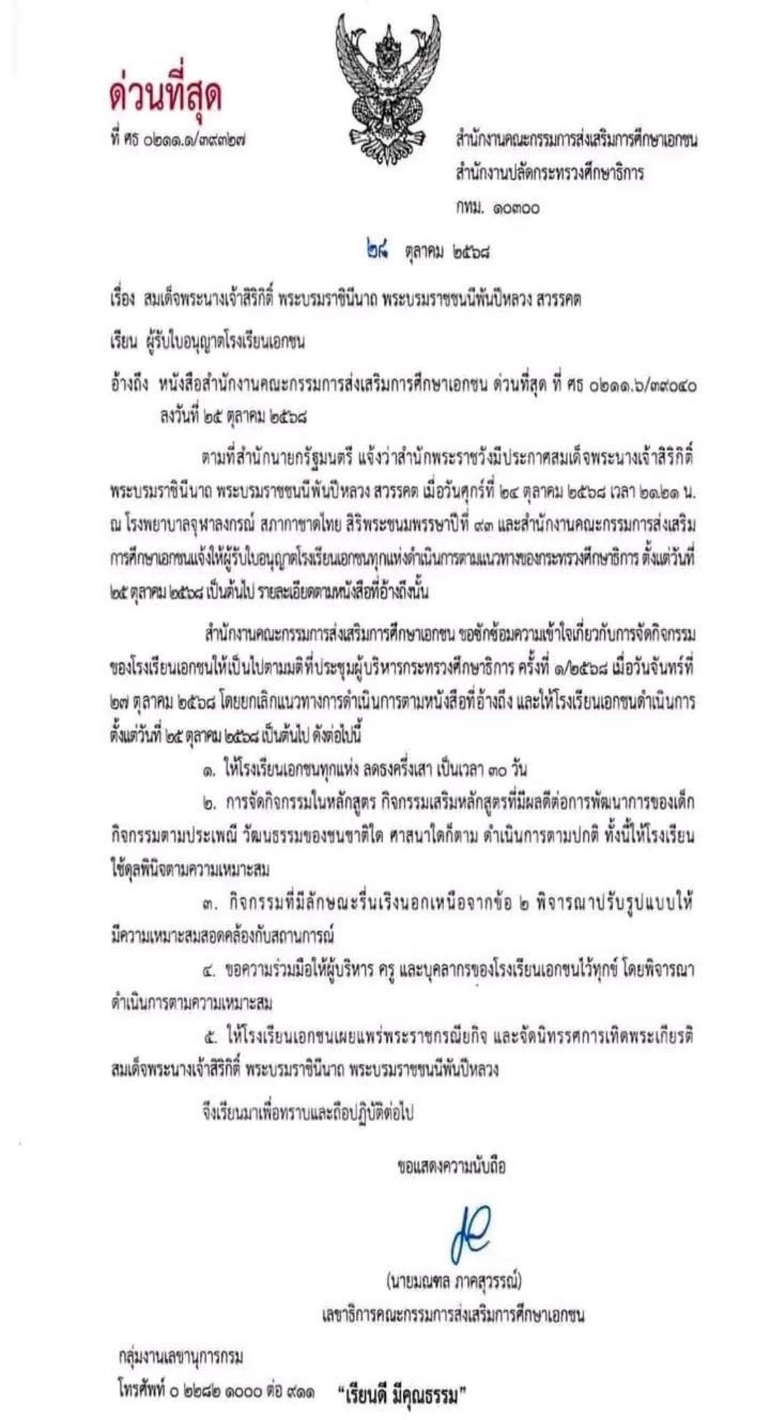 เลขาธิการนายกรัฐมนตรี ยืนยัน ให้ภาคเอกชนงดกิจกรรมรื่นเริงเป็นเวลา 30 วัน นั้น ไม่เป็นความจริง ย้ำ ครม. ไม่ห้ามเอกชนจัดกิจกรรมรื่นเริง ขอเพียงพิจารณาปรับรูปแบบให้เหมาะสมกับบรรยากาศแห่งการไว้อาลัย ระบุ