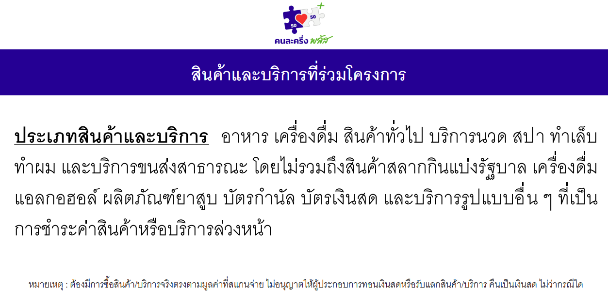 สำหรับสินค้าและบริการที่เข้าร่วมโครงการ ประชาชนสามารถใช้สิทธิจ่ายผ่านแอป “เป๋าตัง” ได้กับร้านอาหารและเครื่องดื่มทั่วไป ร้านขายของใช้จำเป็น สินค้าทั่วไป รวมถึงบริการนวด สปา ทำเล็บ และทำผม
