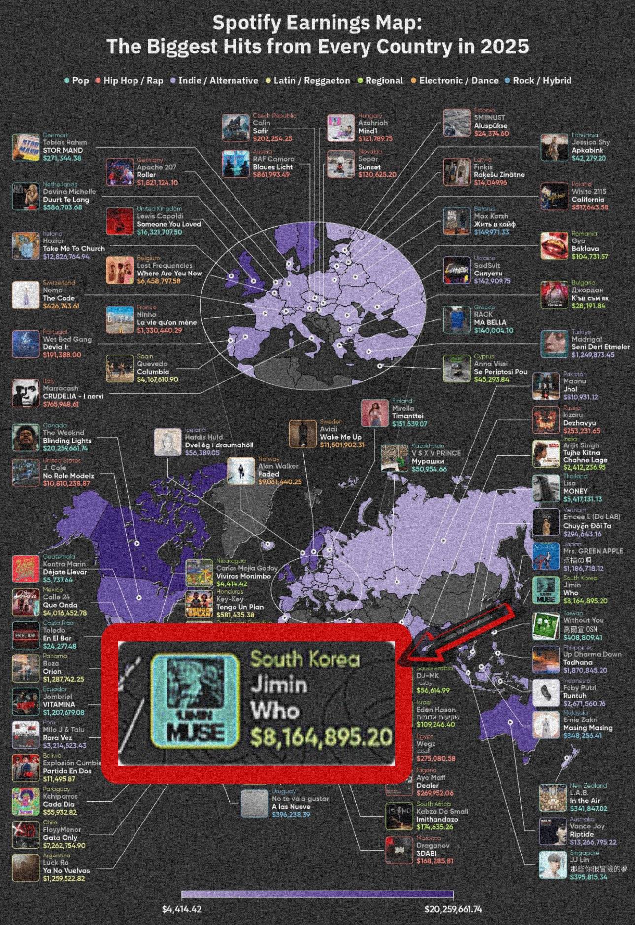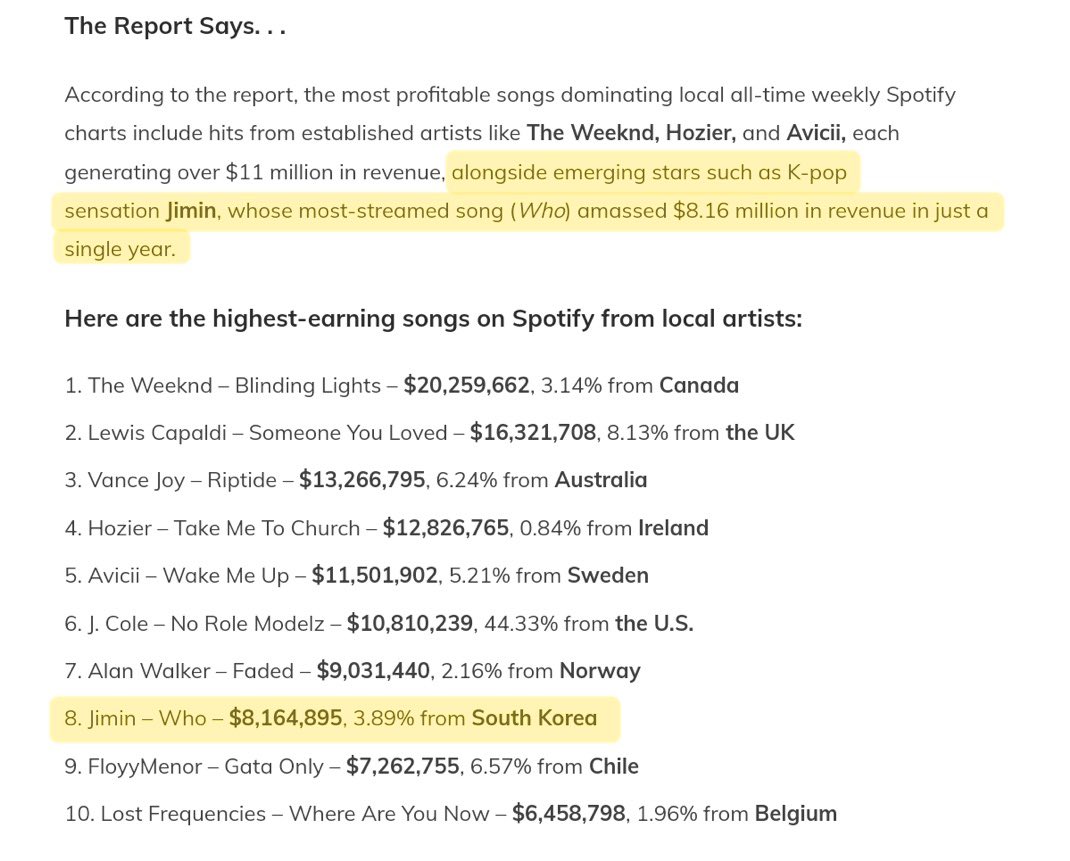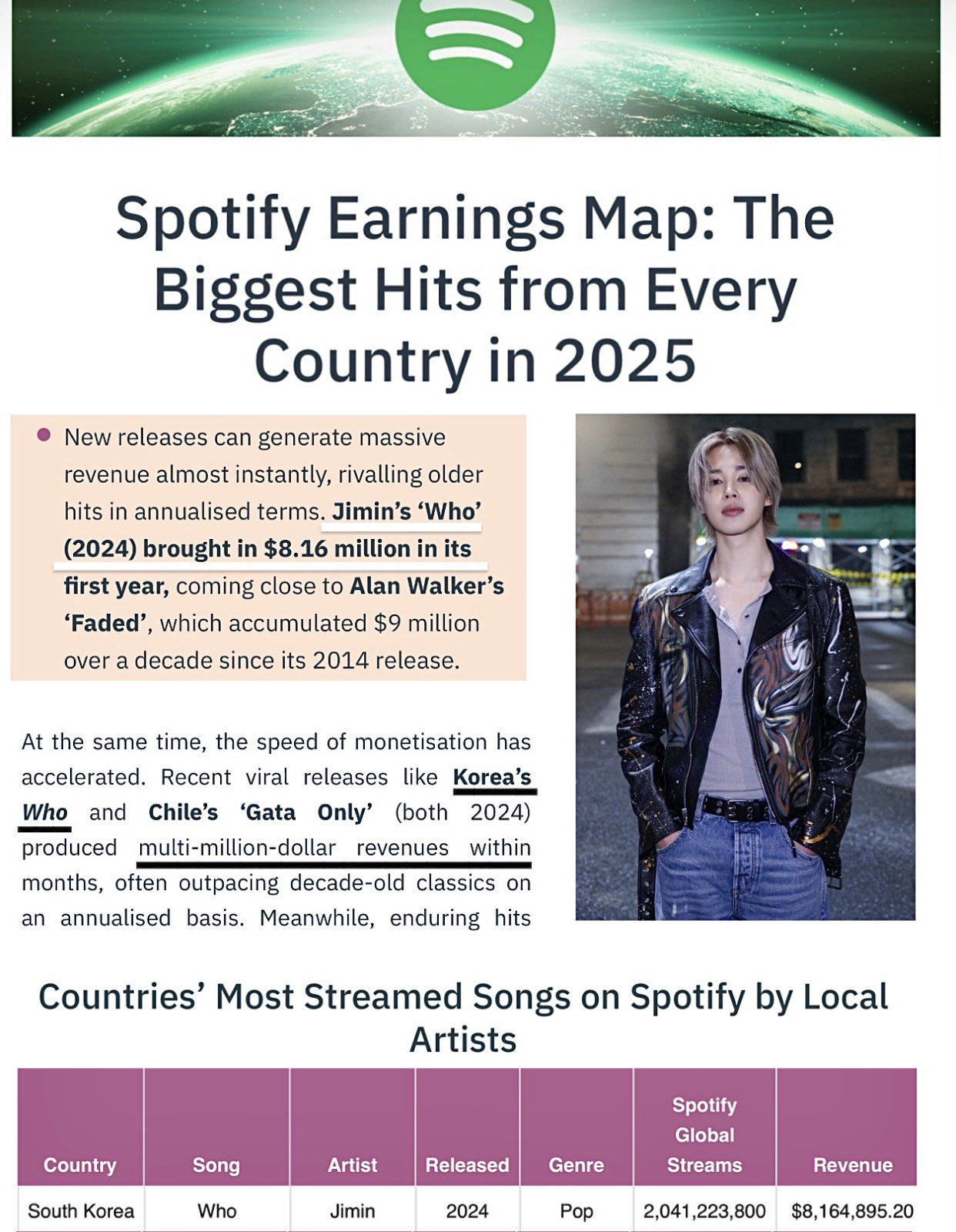 ✨เพลง 'Who' ของ Jimin ทำรายได้บน Spotify 8.16 ล้านดอลลาร์ในปีแรก 👉 เป็นเพลงที่ทำรายได้สูงสุดจากเกาหลีใต้ บน Spotify