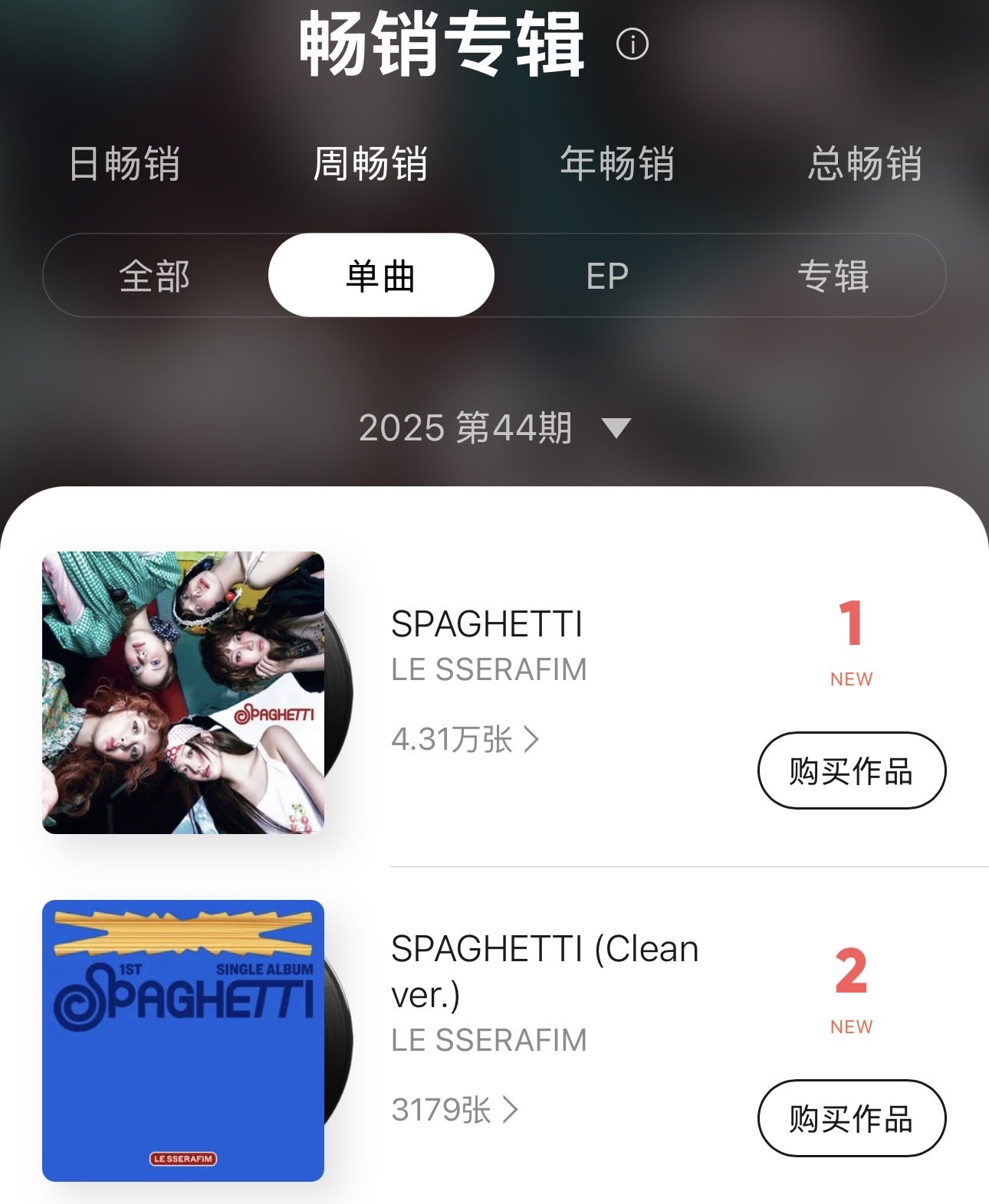 เพลง SPAGETTHI ทั้งเวอร์ชั่นหลักและ Clean Ver. ครองอันดับ #1 และ #2 ของ "Daily Best Selling QQ Music Album Chart" โดยขายได้ 4หมื่นสามพันและอีกสามพันอัลบั้มตามลำดับ