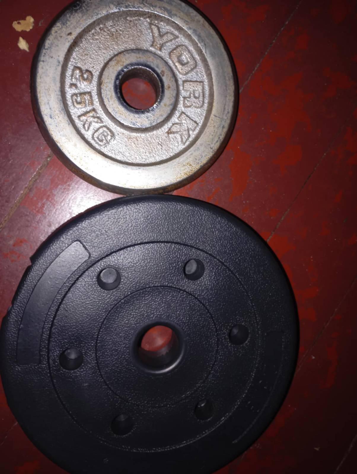 ปัญหาคือ แผ่นน้ำหนักที่หนักสุดคือ 2.5 กิโล มีแผ่นน้ำหนักหลายแผ่น แต่ไม่มีแผ่นที่น้ำหนักมาก และ บาร์เบลที่ซื้อมาคือสั้นเกินไป ใส่แผ่นน้ำหนักมากไม่ได้(ตอนซื้อไม่คิดจะว่าเพิ่มน้ำหนักอะไรเยอะแยะด้วยละ)
