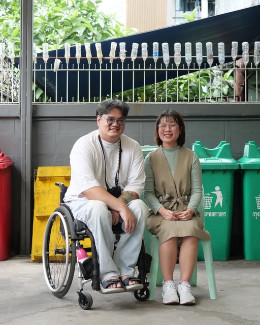 “เราคบกันมาสองปีกว่าแล้ว ตอนทำงานเขาโคตรเวิร์คกิ้งวูแมน แต่พอเป็นแฟน เขาเป็นคนติงต๊องคนหนึ่งนะ (ยิ้ม) ผมใช้วีลแชร์ เขาตาบอด ภาพที่คนอื่นเห็นคือเหมือนเขาช่วยเข็น แต่ความจริงคือผมลากตัวเองแล้วเขาจับเดินตามไป ผมเคยมีคำถามว่า คนตาบอดดูหนังยังไง ก็ได้รู้จักกับ Audio Description (เสียงบรรยายภาพ) ทำให้เราดูหนังใน Netflix ด้วยกันได้ หรือเวลากินข้าว ผมนึกภาพไม่ออกว่าต้องทำยังไง ต้องป้อนทุกครั้งไหม เขาก็ให้ป้อนด้วย จนวันหนึ่งไปกินข้าวกับเพื่อนของเขา แล้วเพื่อนของเขาพูดว่า ‘เป็นอะไร ปกติกินข้าวเองได้นี่หว่า’ ผมก็ อ้าว กินเองได้เหรอ