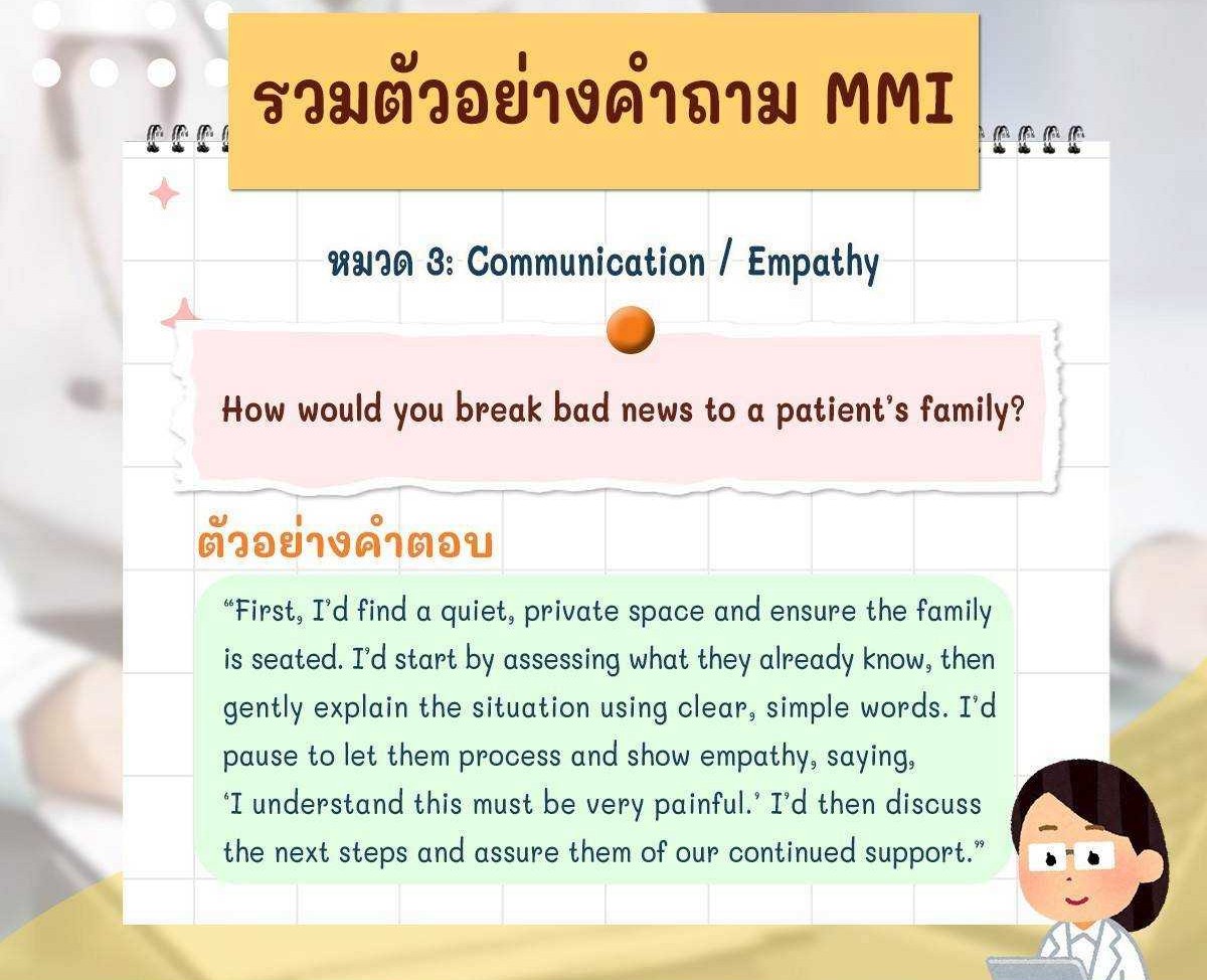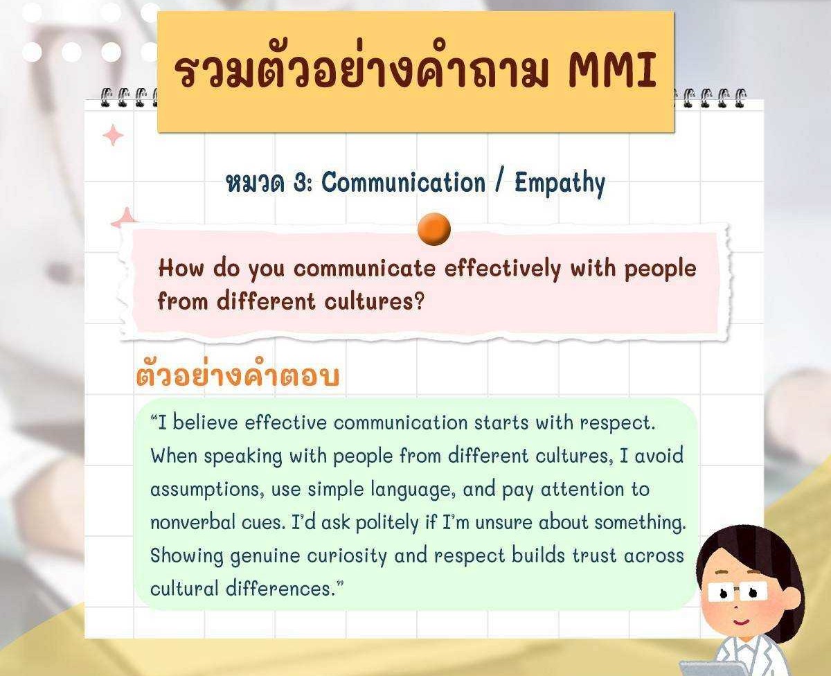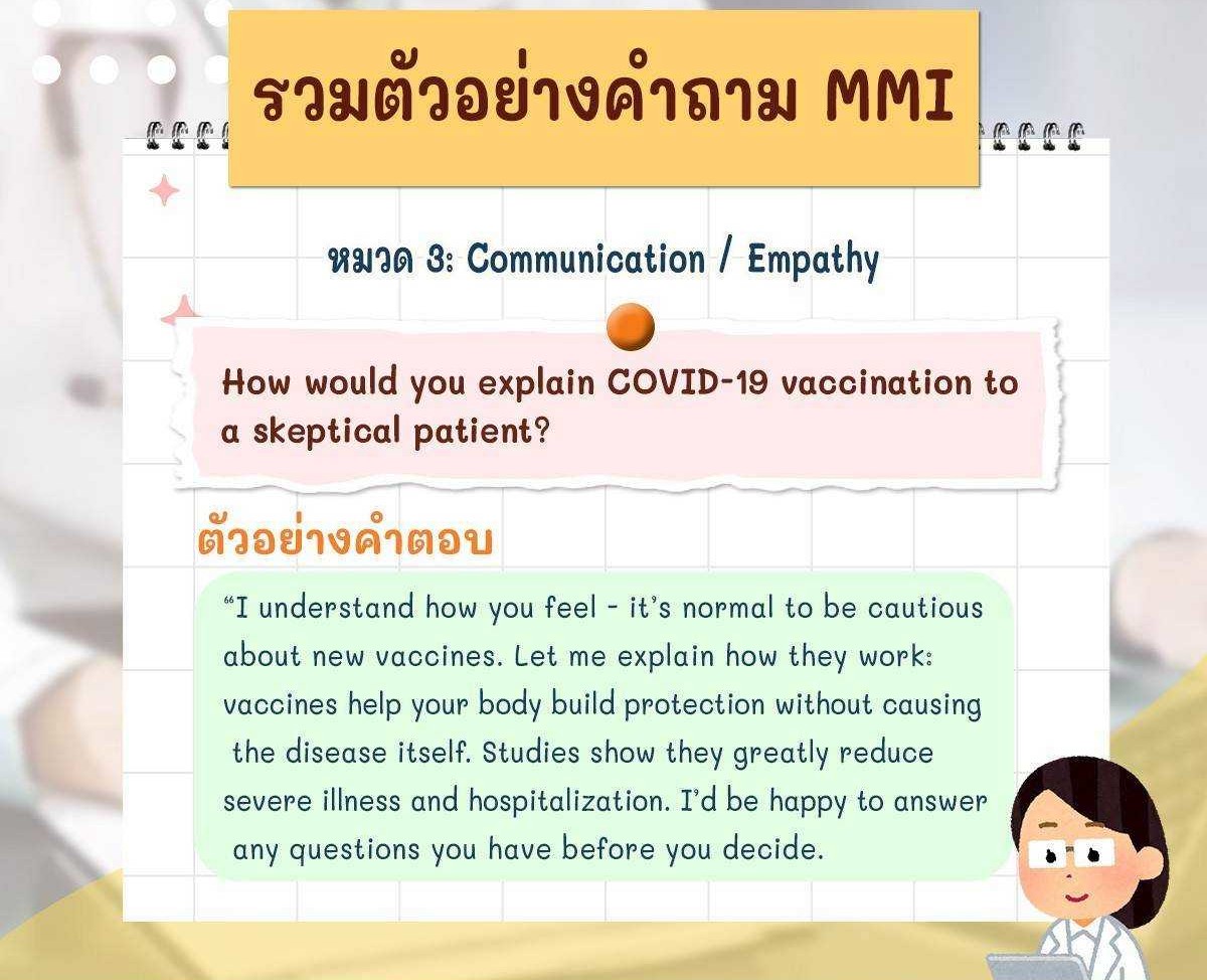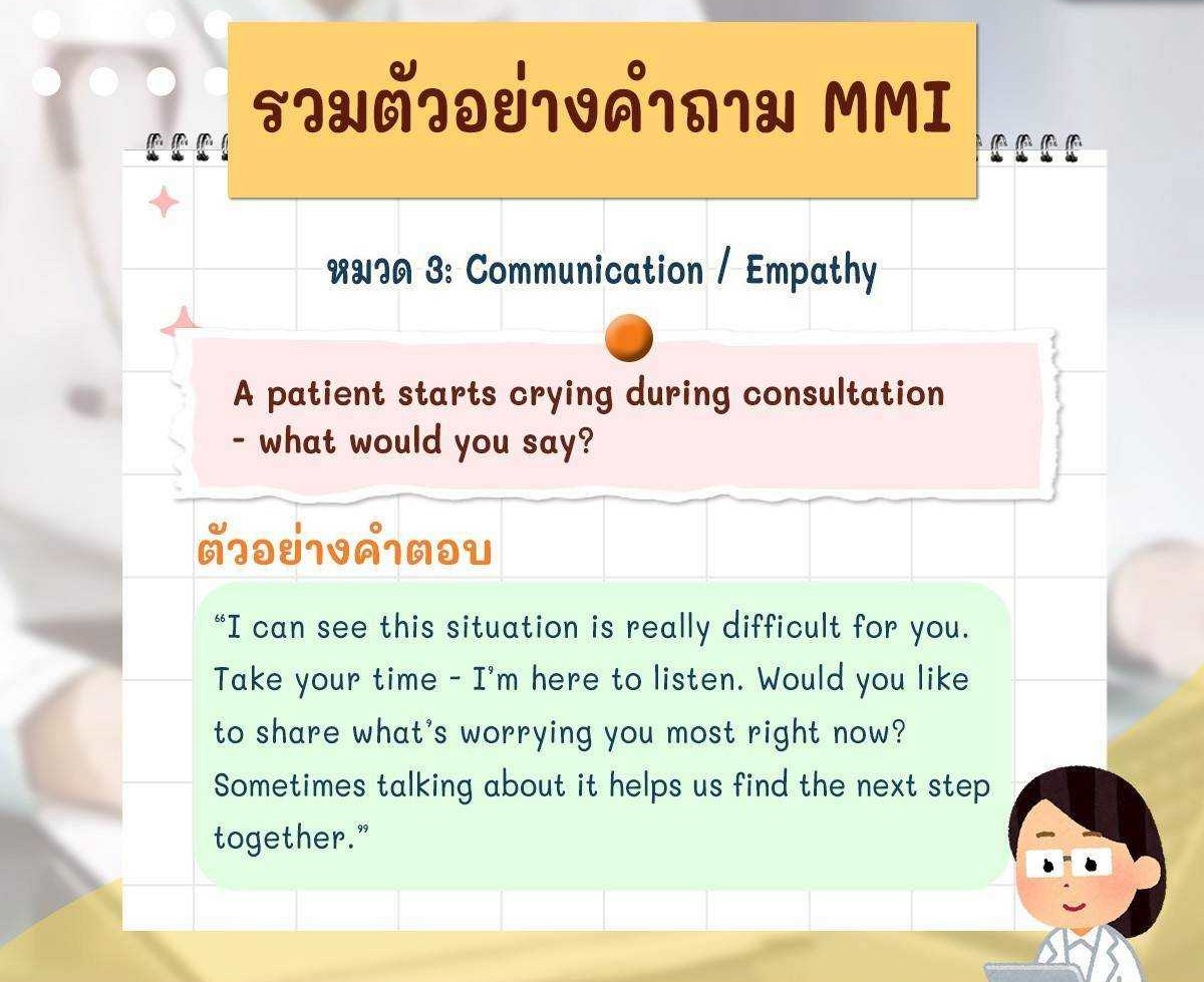 เพราะรอบ MMI (Multiple Mini Interview) ไม่ได้วัดแค่ความรู้ แต่ยังดู “ทักษะการสื่อสาร ความเห็นอกเห็นใจ และการคิดอย่างมีเหตุผล” — สิ่งที่โรงเรียนแพทย์ทั่วโลกให้ความสำคัญมากที่สุด