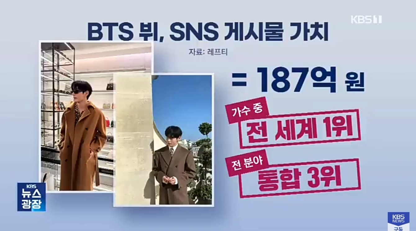 จากการวิเคราะห์ของพวกเขา พบว่าภาพถ่าย 2 ภาพที่ V ของ BTS โพสต์หลังจากเข้าร่วมงานแสดงแฟชั่น CELINE ในงาน Paris Fashion Week เมื่อต้นเดือนนี้ สามารถสร้างผลกระทบในการส่งเสริมการขายได้สูงถึง 18.7 พันล้านวอน ( ≈ 13.5 ล้านเหรียญสหรัฐ) ในบรรดากลุ่มดนตรีทั้งหมดทั่วโลก BTS อยู่ในอันดับที่ 1 ในด้านมูลค่าการเปิดเผยสื่อ และเมื่อพิจารณาจากอุตสาหกรรมทั้งหมดรวมกัน V อยู่ในอันดับที่ 3 ซึ่งถือเป็นตัวเลขที่ไม่ธรรมดา