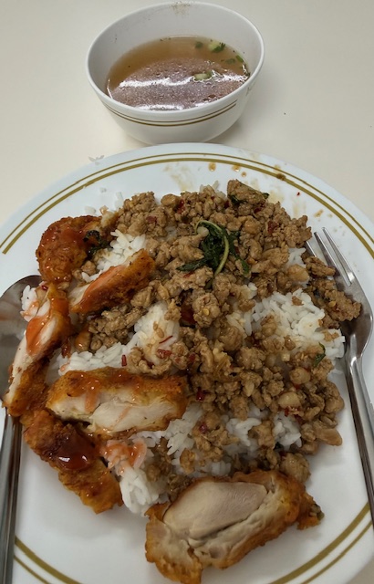 เริ่มด้วยปลาสวายของโปรด ควบปลาดุกของชอบ แล้วข้าวขาหมูอีกสองจาน หมอประจำตัวมองค้อน แต่มันก็อิ่มกำลังดี ตบด้วยของหวานแก้เลี่ยน สบายใจ