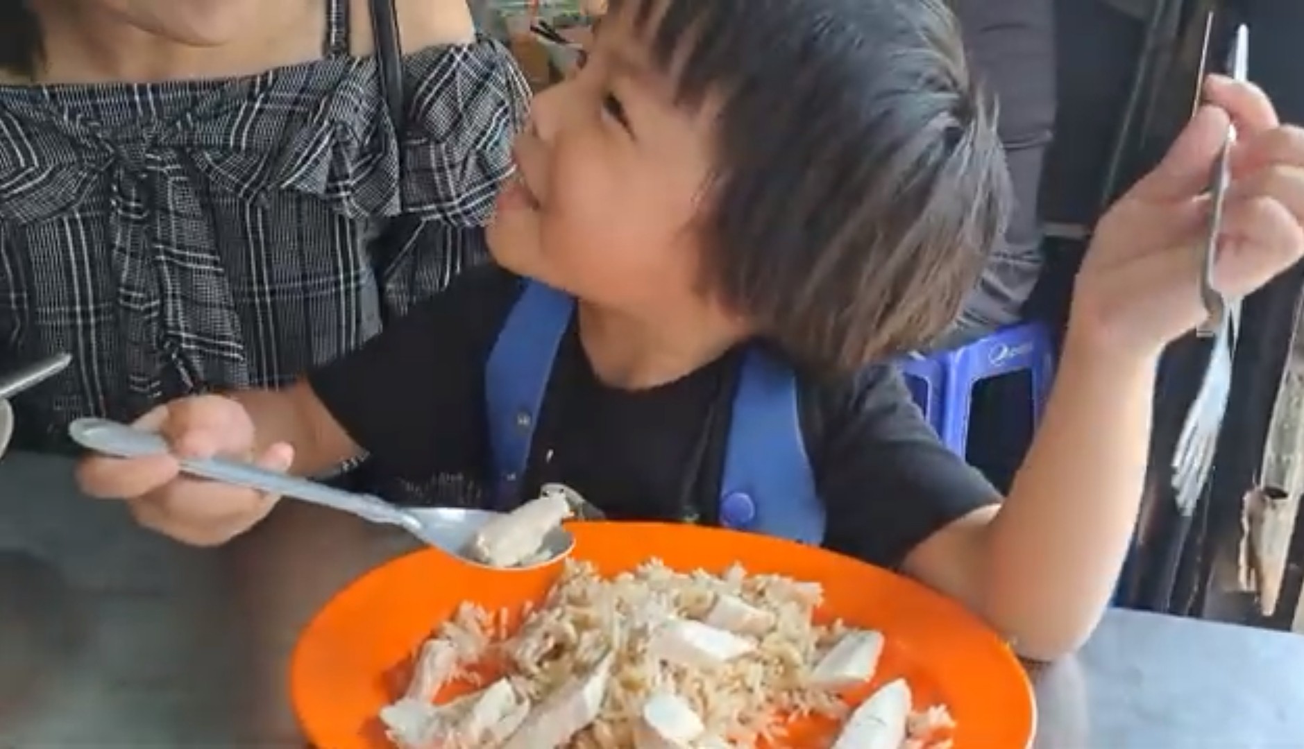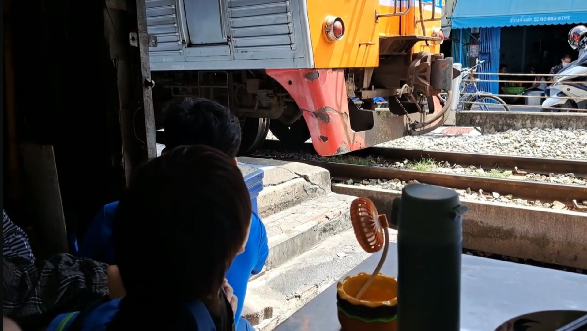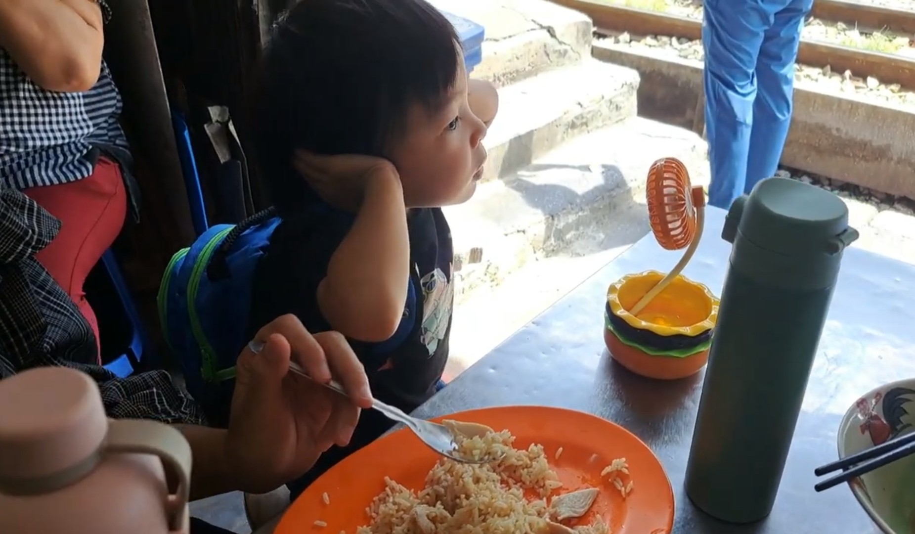 พาลูก นั่งกินข้าวติดรางรถไฟที่ สถานีรถไฟตลาดพลู