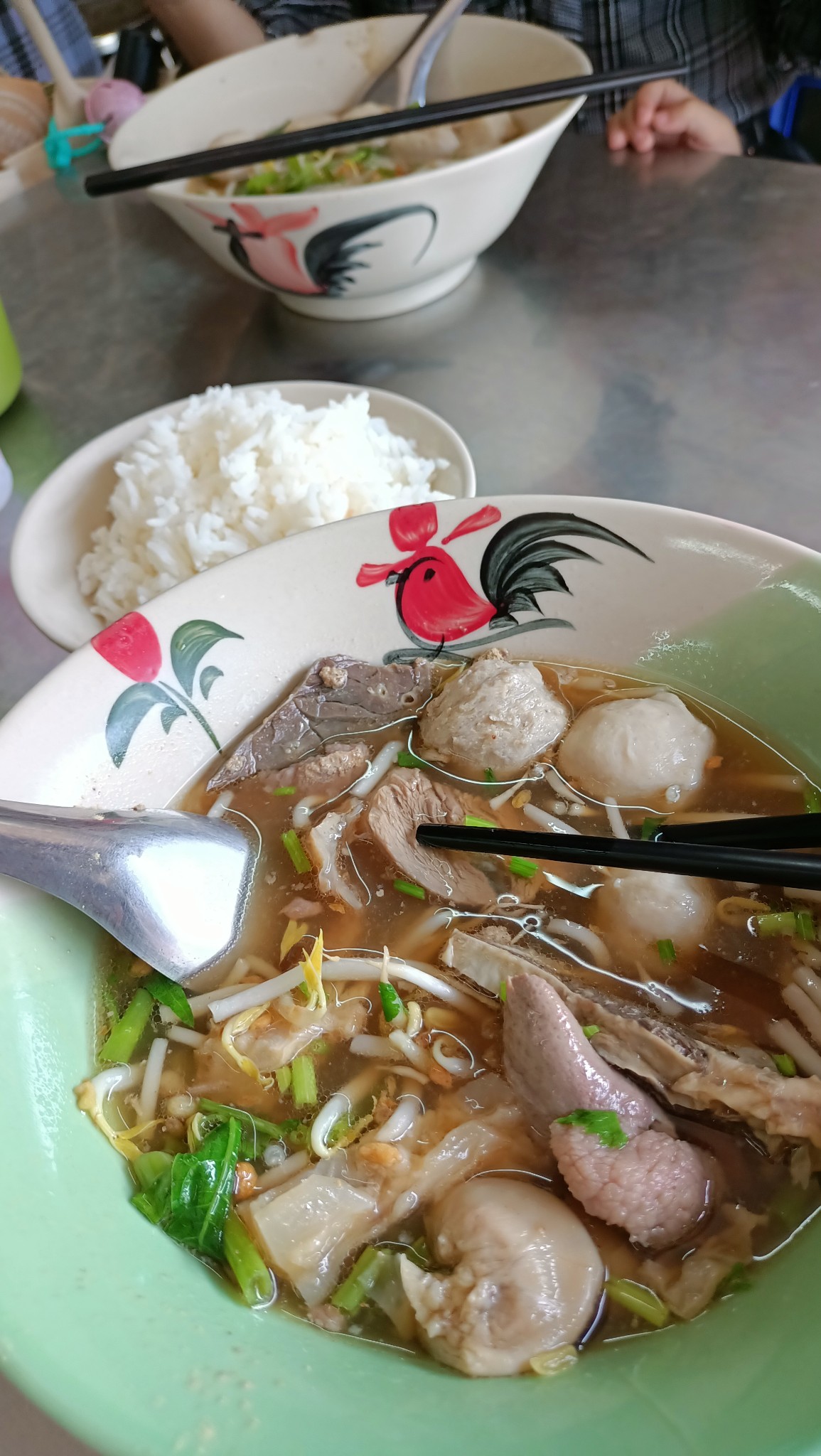 ลูกกินข้าวมันไก่ ส่วนผมกินเกาเหลาเนื้อใส่ทุกอย่าง และข้าวปล่า 1 ถ้วย