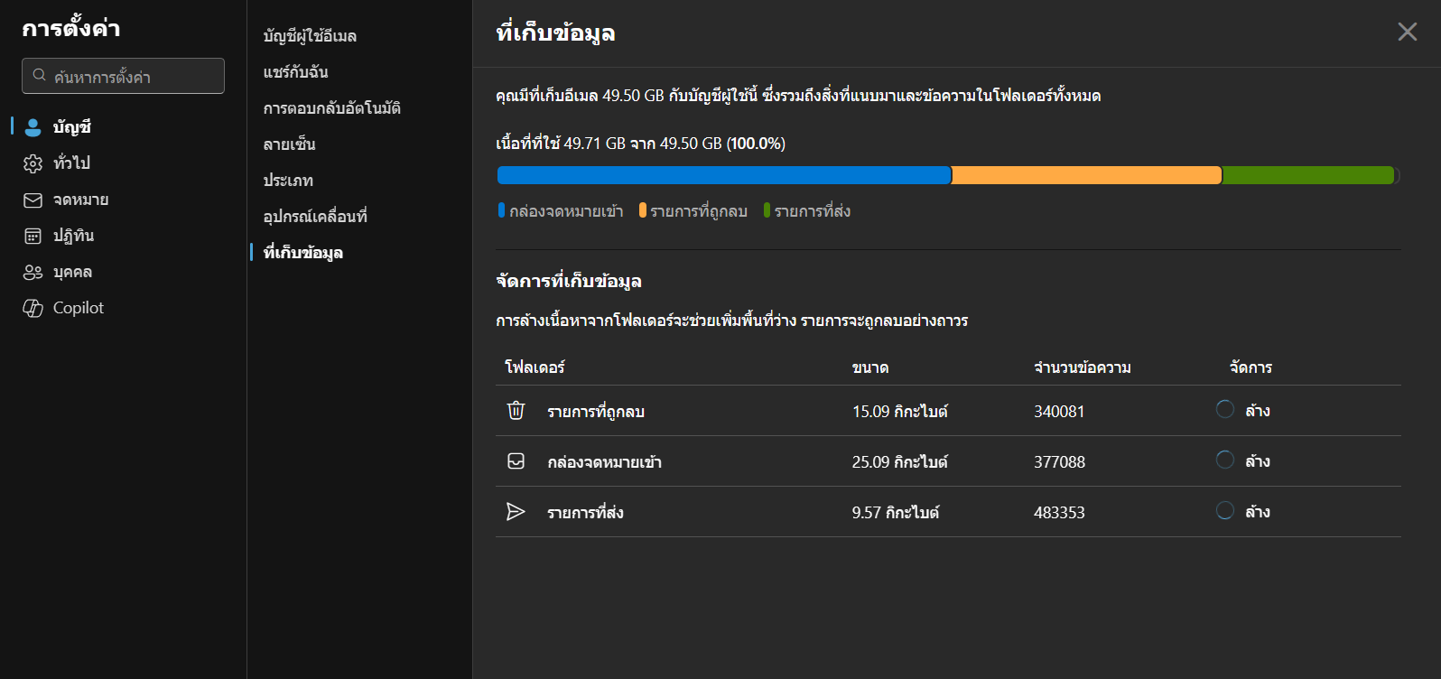 ลองเลือกลบทีละไม่เยอะแล้ว แต่ก็ดูช้ามากครับ แถมข้อความที่ถูกลบยังไม่แสดงในโฟลเดอร์ รายการที่ถูกลบ หรืออาจจะประมวลผลช้ามาก