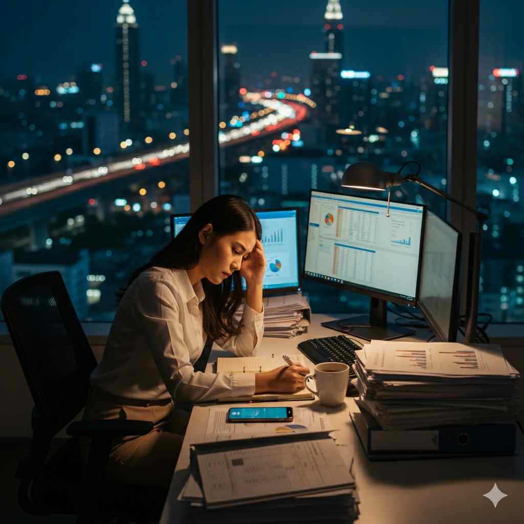 วันศุกร์เย็น น้ำฝนรู้สึกเหนื่อยล้าจนอยากจะทิ้งตัวลงนอนทันที การนัดเพื่อนเพื่อสังสรรค์กลายเป็นเรื่องยาก เพราะเธอต้องบริหารเวลาให้กับการดูแลบ้าน การจัดการธุระของธนาคาร และการโทรศัพท์ไปคุยกับพ่อแม่เพื่อดูแลความเป็นอยู่บทที่ 2: ชั่วโมงแห่งความจริง (วัยทำงาน)