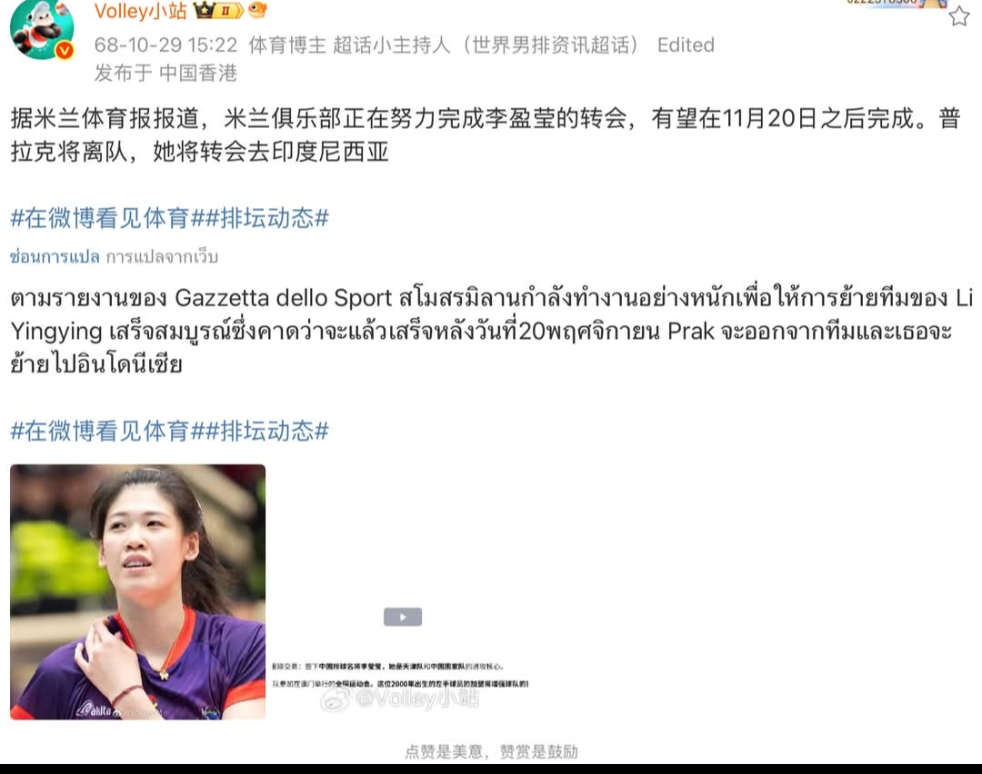 สื่อจีนรายงาน!!!หลี่ อิ๋งอิ๋ง อาจย้ายไปเล่นกับทีมมิลาโน่ในฤดูกาลนี้😍😍😍😍