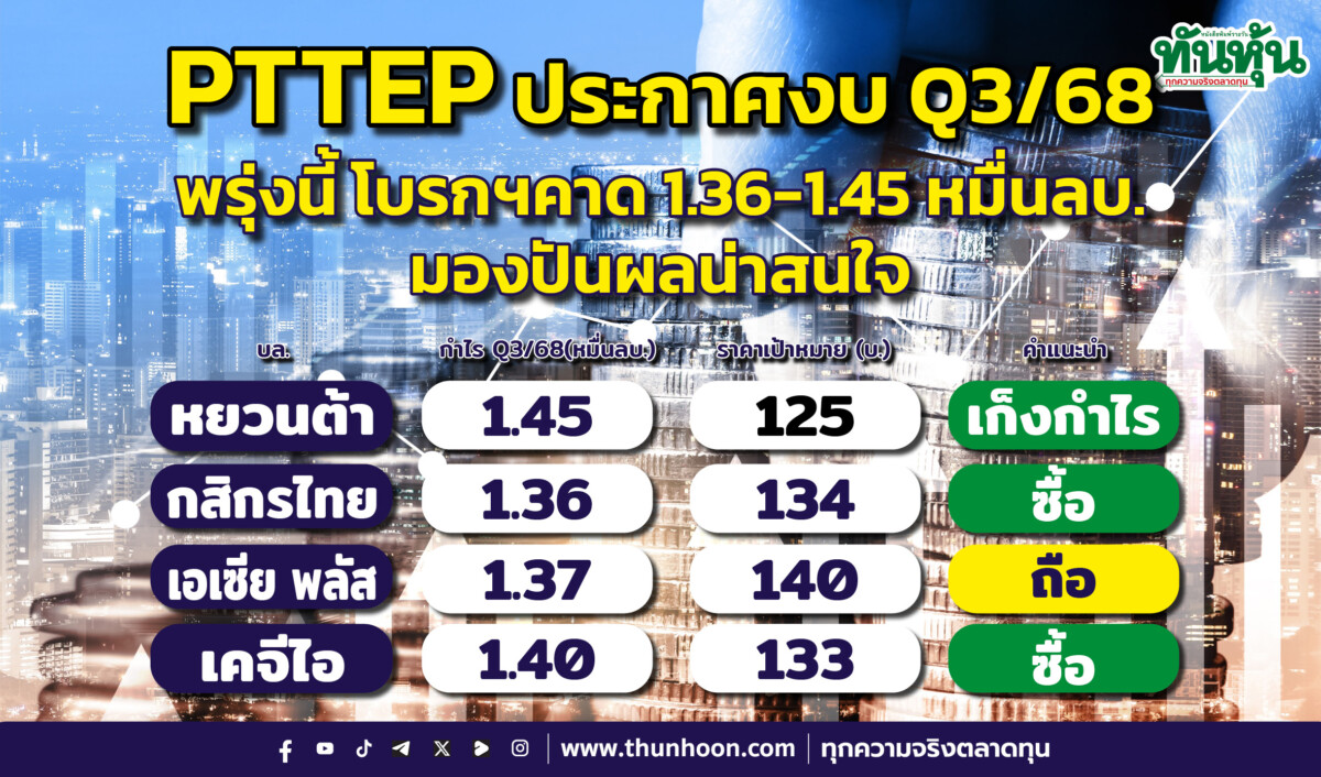 PTTEP ประกาศงบ Q3/68 พรุ่งนี้ โบรกฯคาด 1.36-1.45 หมื่นลบ., มองปันผลน่าสนใจ