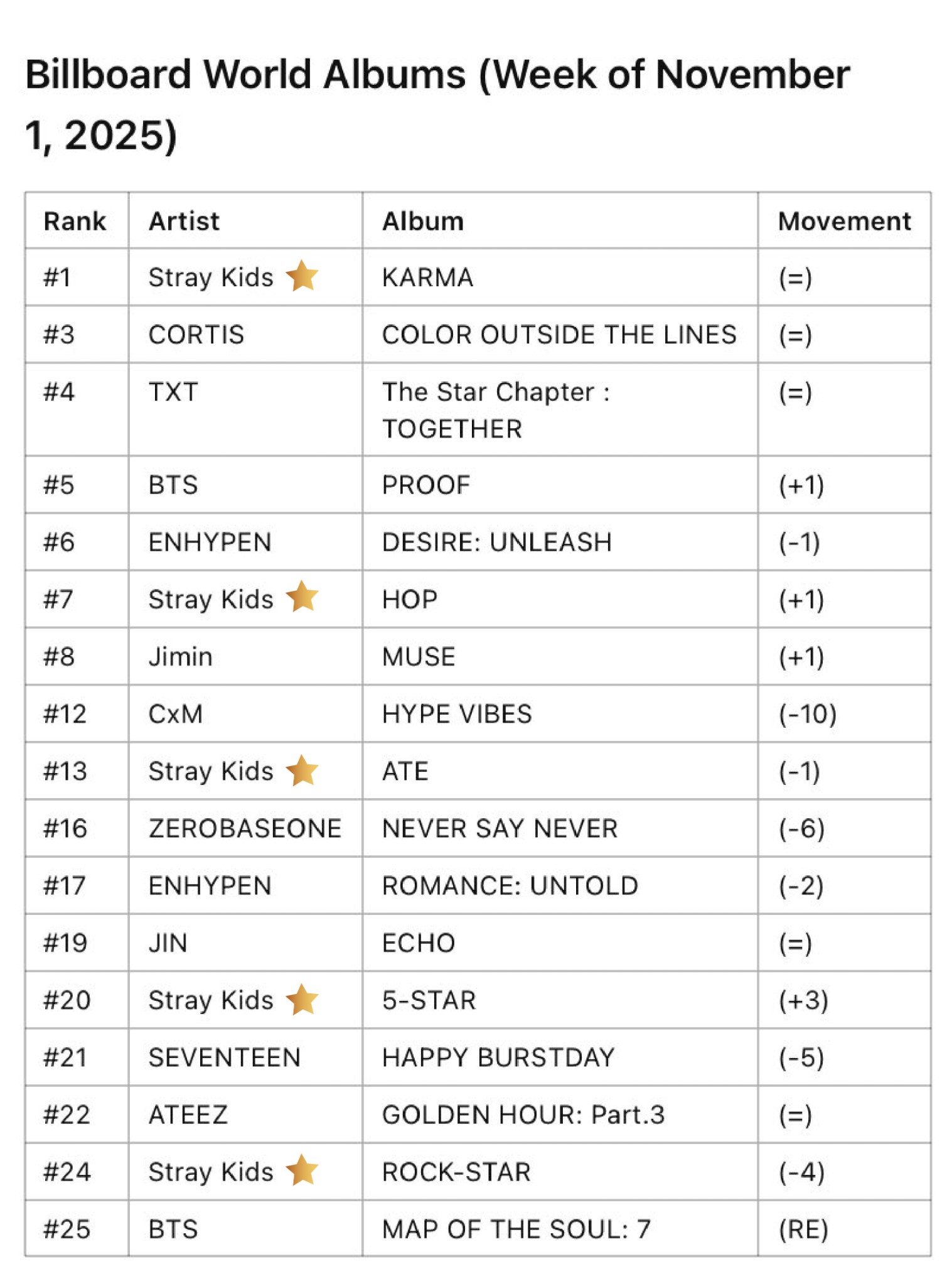 🔥 Stray Kids “KARMA” อัลบั้มอันดับ 1 บน Billboard World Albums ที่ติดชาร์ตยาวนานที่สุดด้วยระยะเวลา 9 สัปดาห์ ทำให้อัลบั้มนี้สร้างสถิติอันดับ 1 ที่ยาวนานที่สุดในปี 2025 อีกด้วย