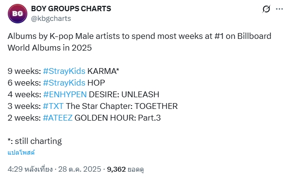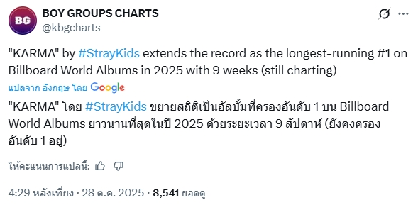 🔥 Stray Kids “KARMA” ขยายสถิติอัลบั้มที่ครองอันดับ 1 บน Billboard World Albums ยาวนานที่สุดในปี 2025 เป็นเวลา 9 สัปดาห์