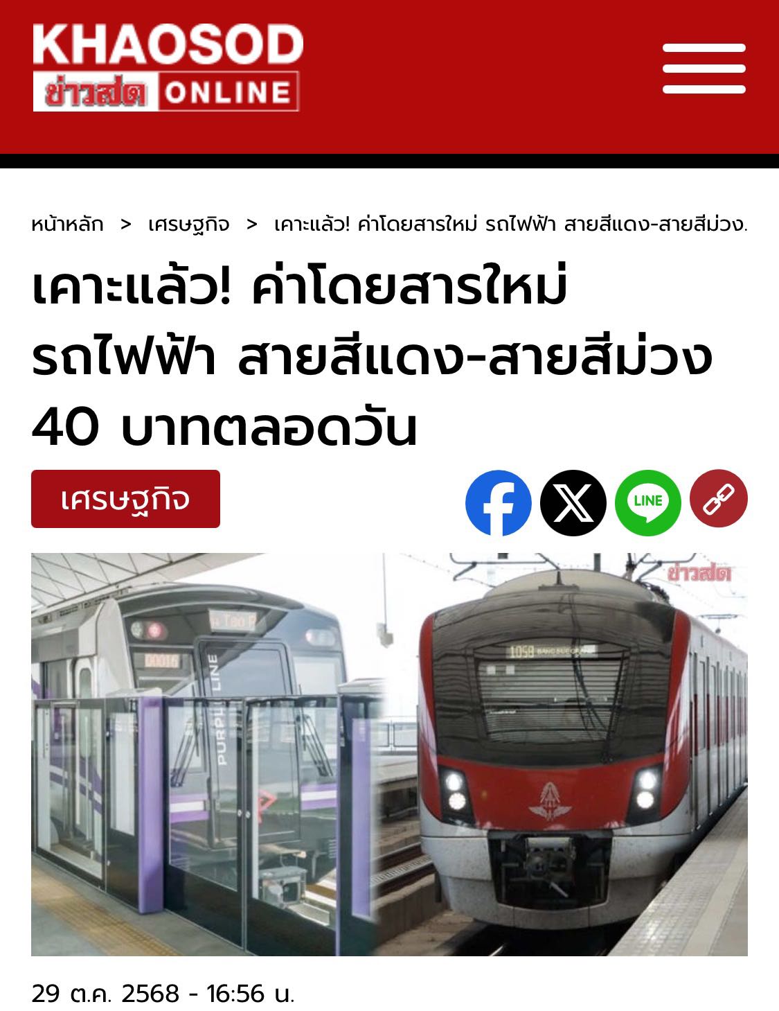 เคาะแล้ว! ค่าโดยสารใหม่ รถไฟฟ้า สายสีแดง-สายสีม่วง 40 บาทตลอดวัน