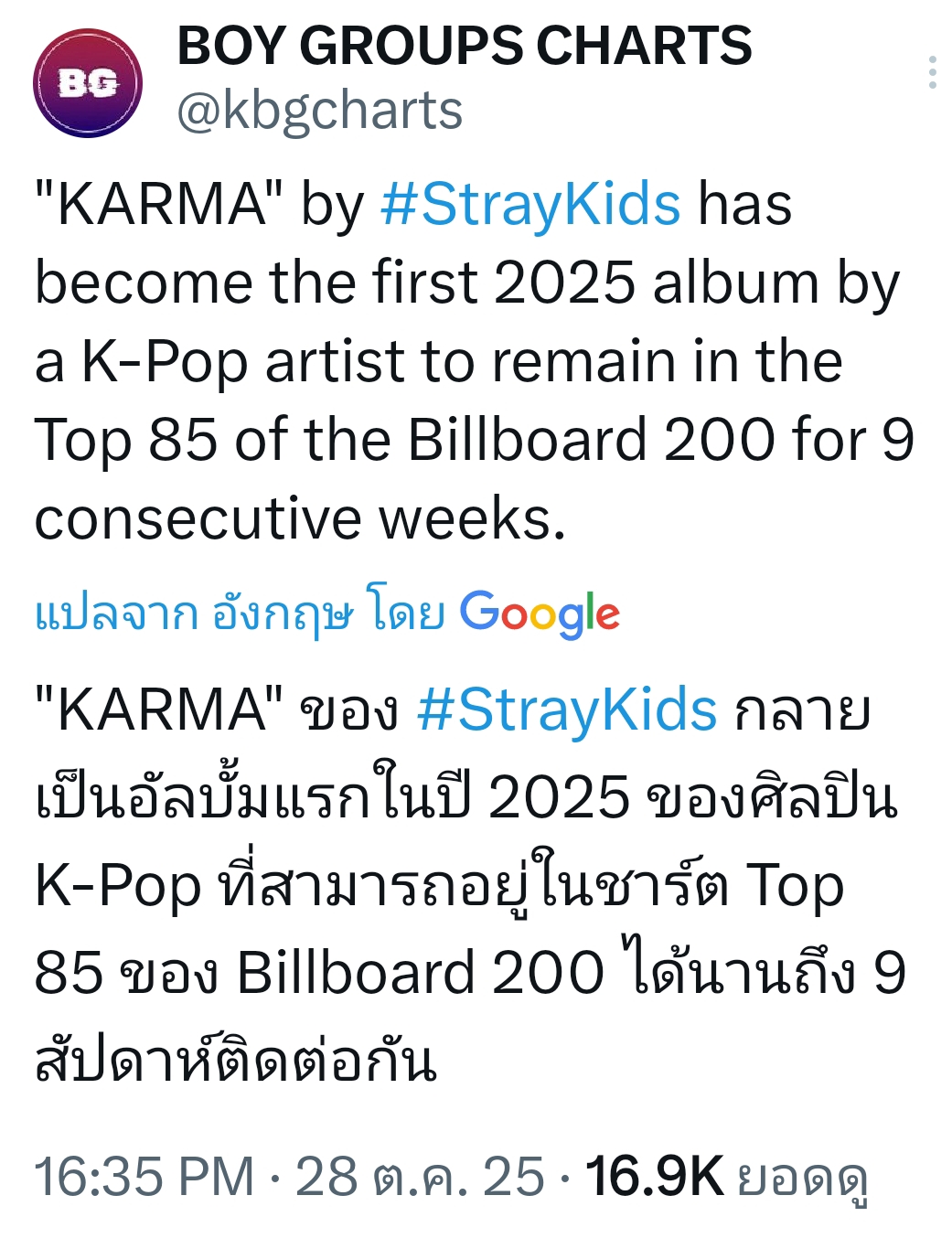 🔥 Stray Kids "KARMA" ครองอันดับ 82 บน Billboard 200 กลายเป็นอัลบั้มแรกของ K-Pop ในปี 2025 ที่อยู่ใน Top 85 ของชาร์ต Billboard 200 ติดต่อกันเป็นเวลา 9 สัปดาห์