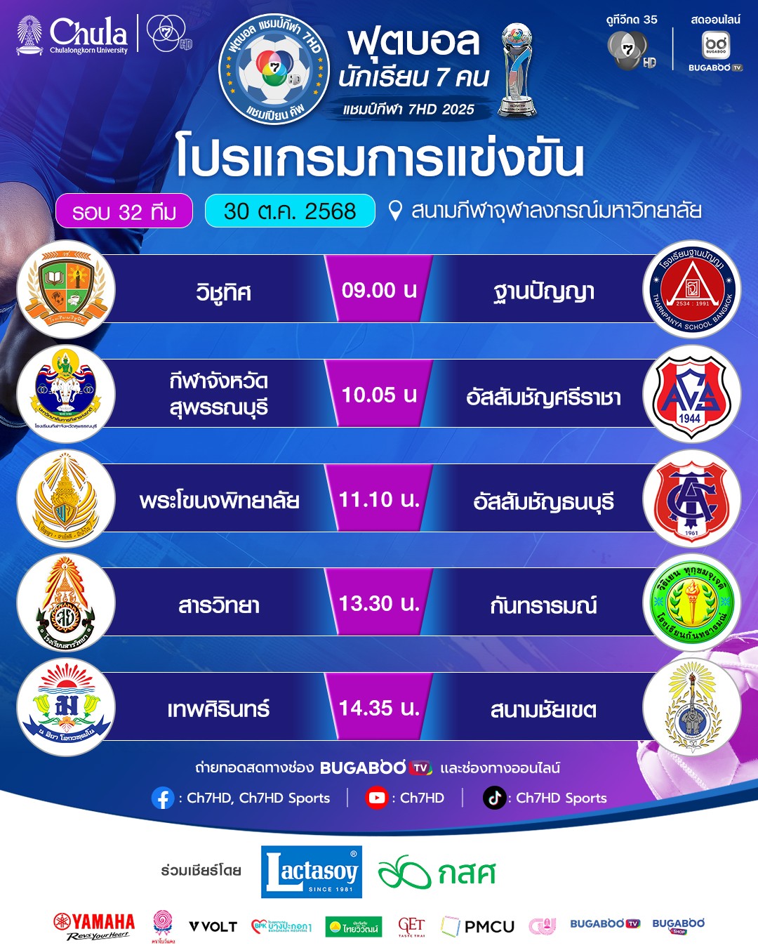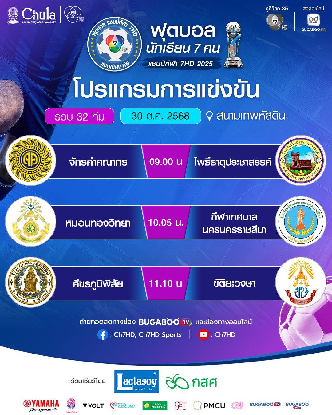โปรแกรมการแข่งขัน ฟุตบอลนักเรียน 7 คน แชมป์กีฬา 7HD 2025 30 ต.ค 68