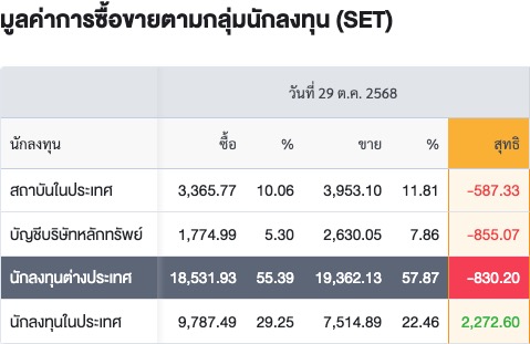 Sinthorn Summary 29/10/2568 : ต่างชาติขายสุทธิ -830.20 ลบ.